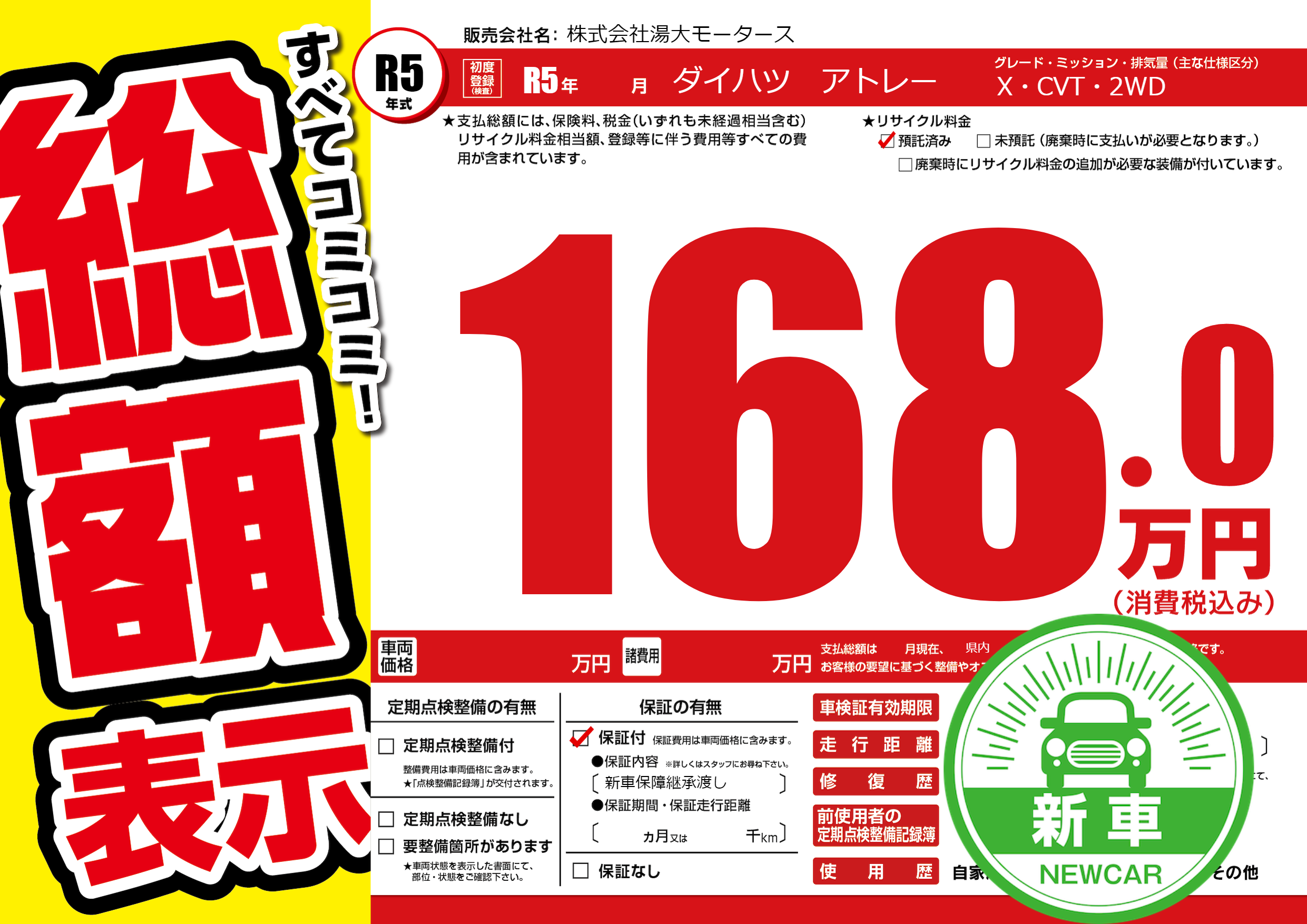 保証付き 保証内容(新車保障継承渡し) ヶ月または千km |