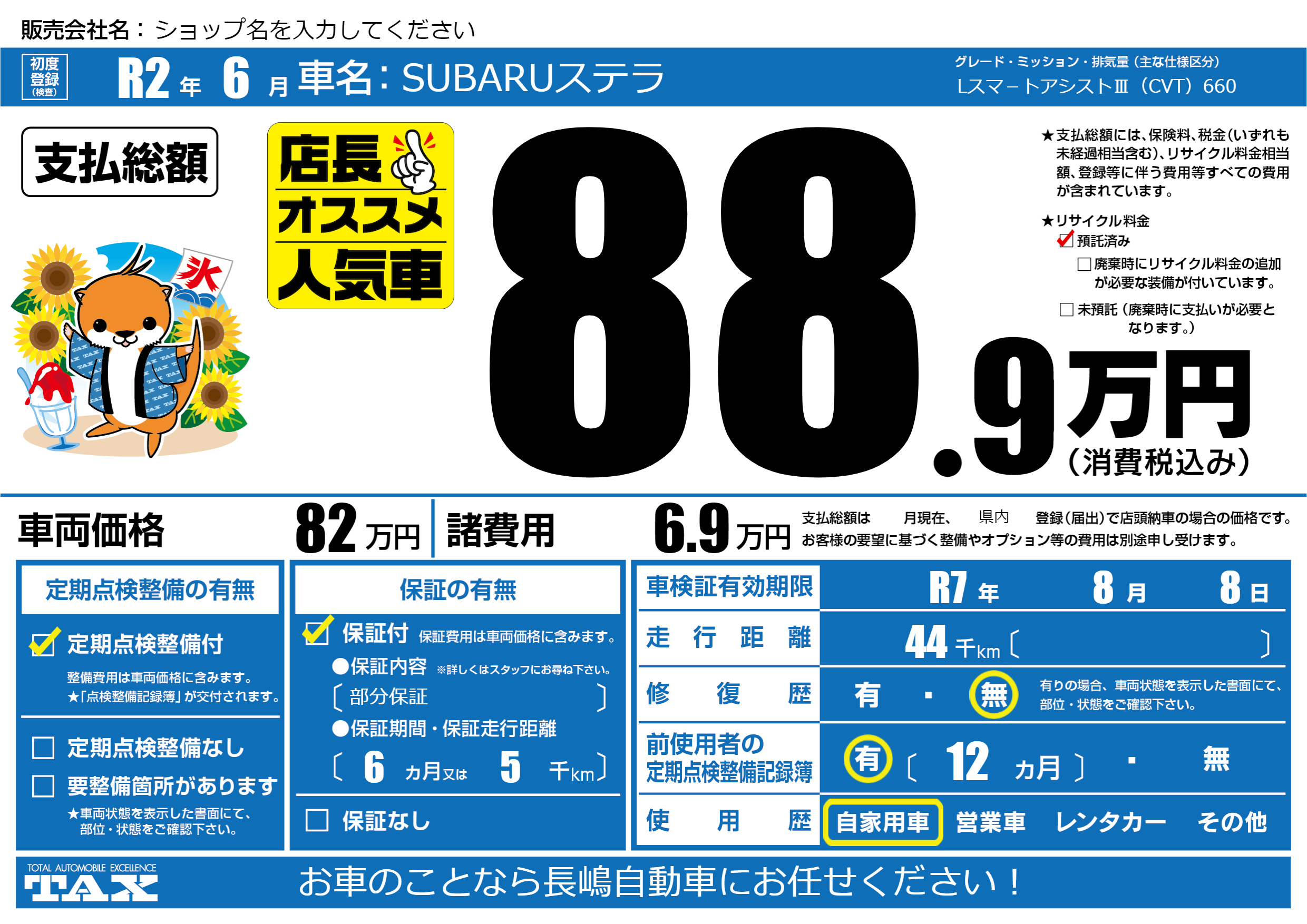 | 車検制限 | R7年 8月 8日 | ||