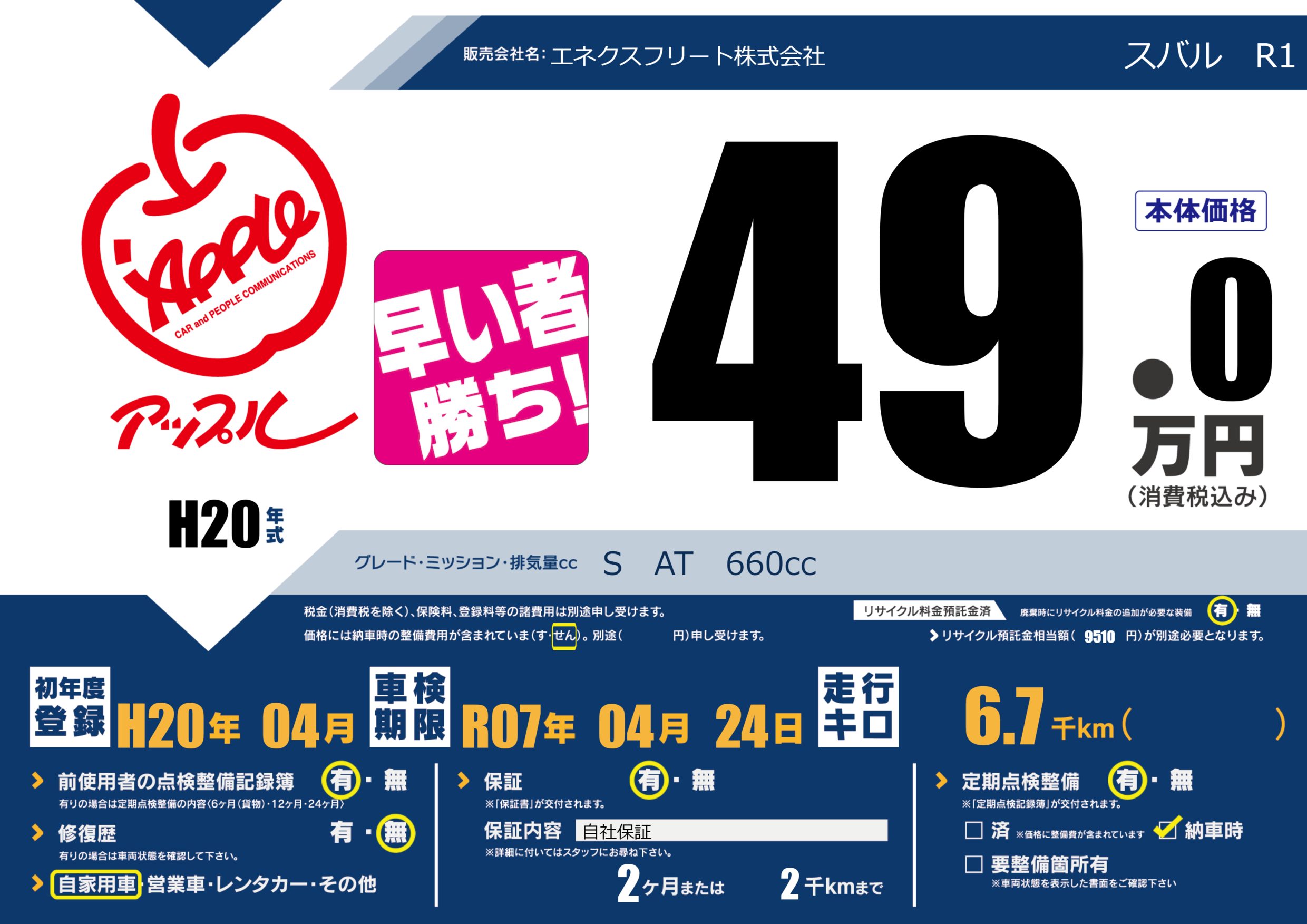 | 車名 | スバル R1 | グレード ミッション 排気量 |