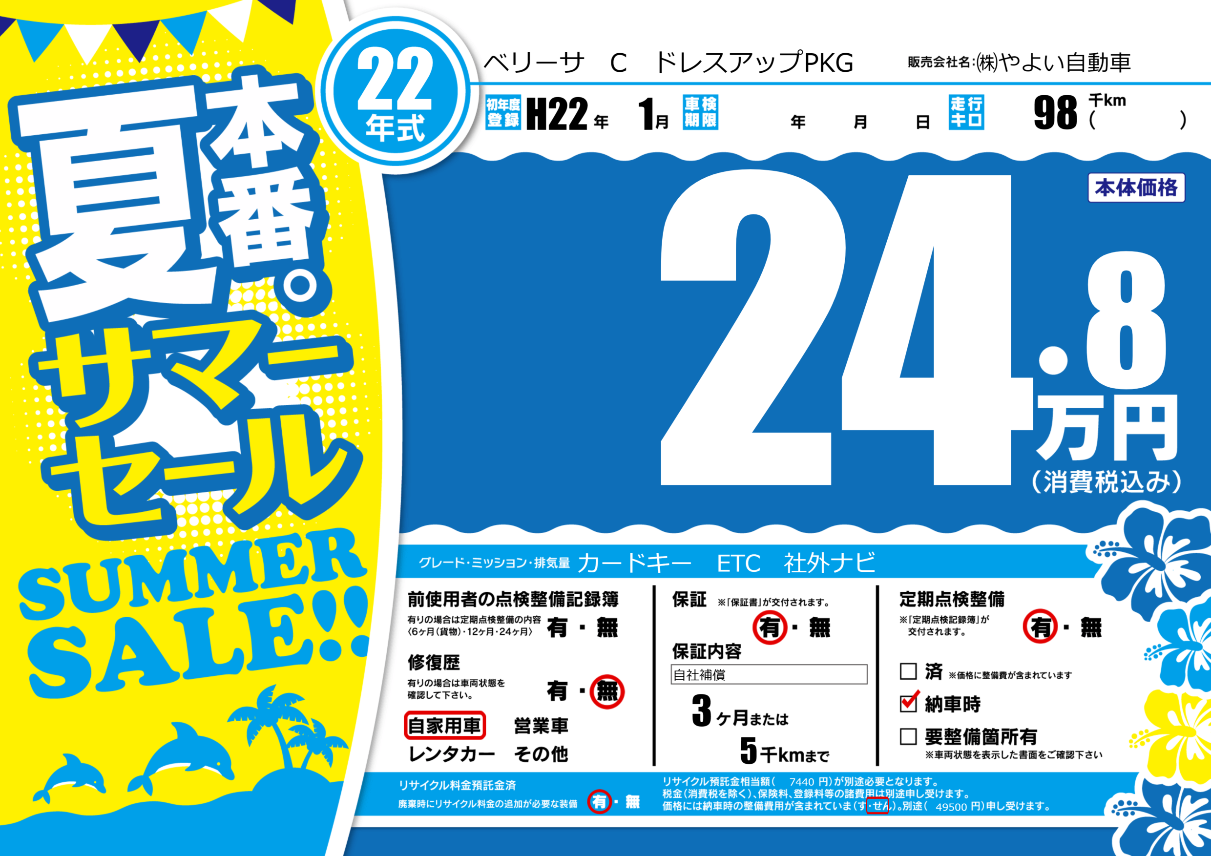 | 走行キロ | 9.8万km | 初年度登録 | H22年1月 |