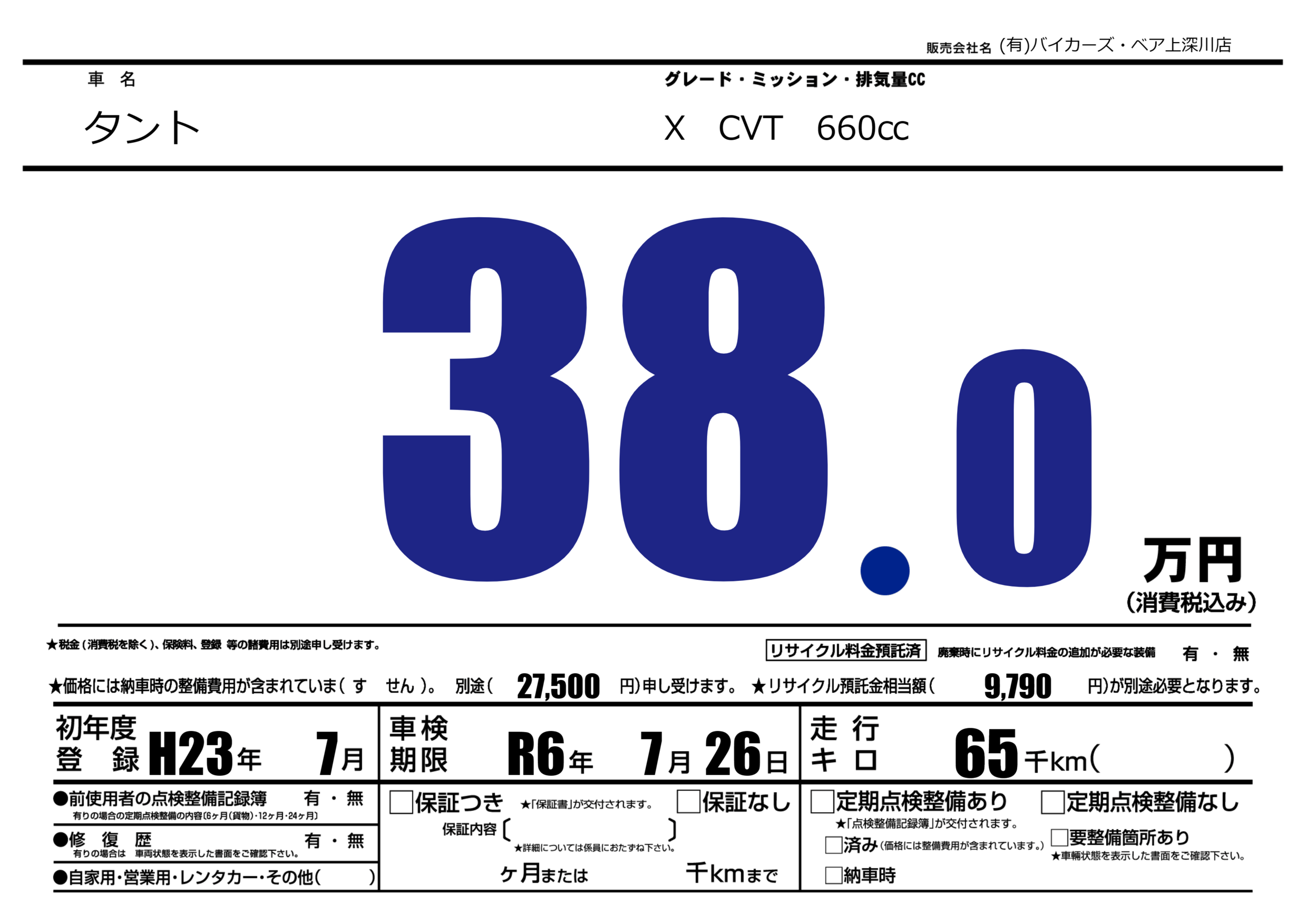| 車名 | タント | グレード ミッション 排気量 |