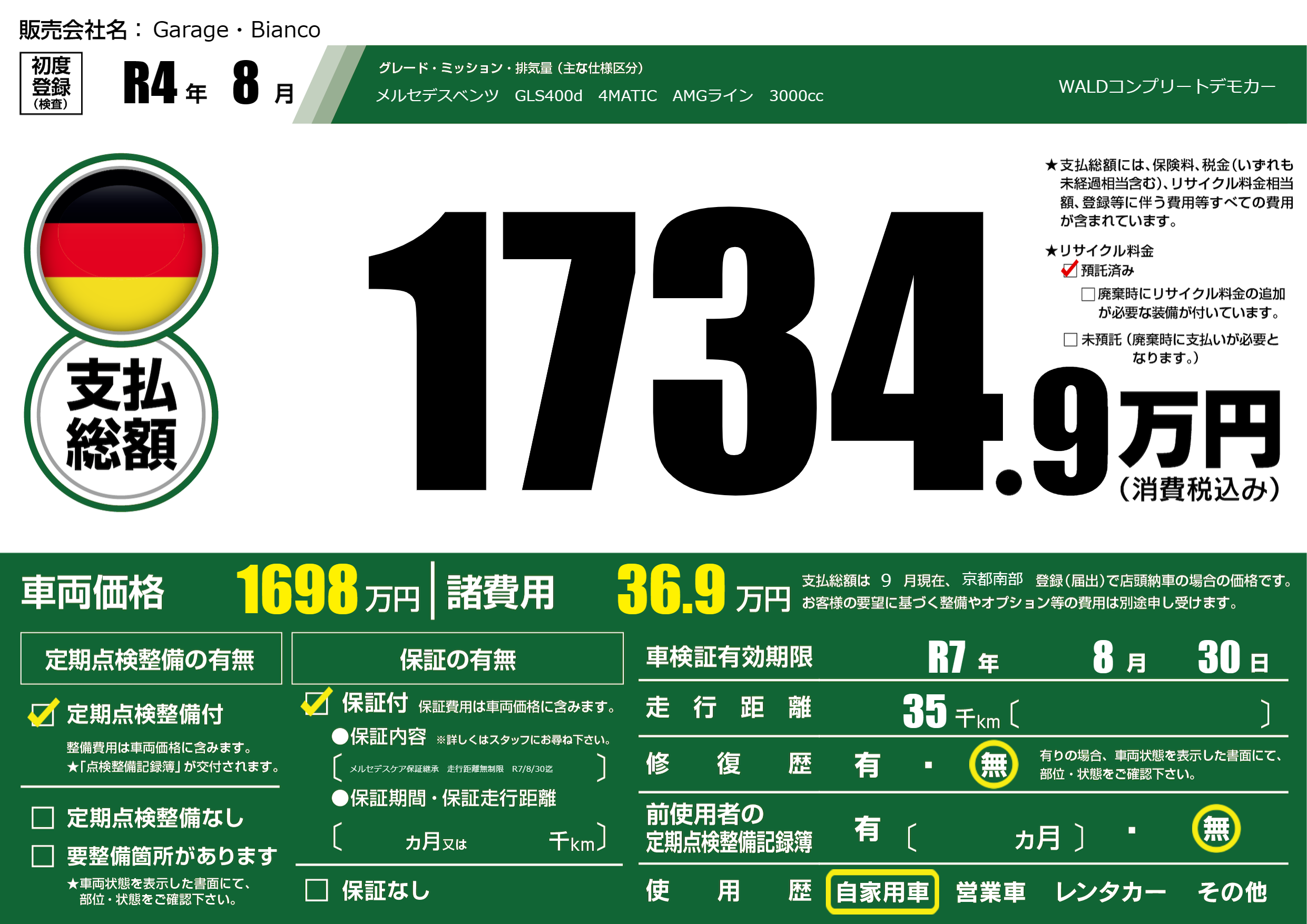 | 車名 | メルセデスベンツ GLS400d 4MATIC AMGライン 3000cc | グレード ミッション 排気量 |