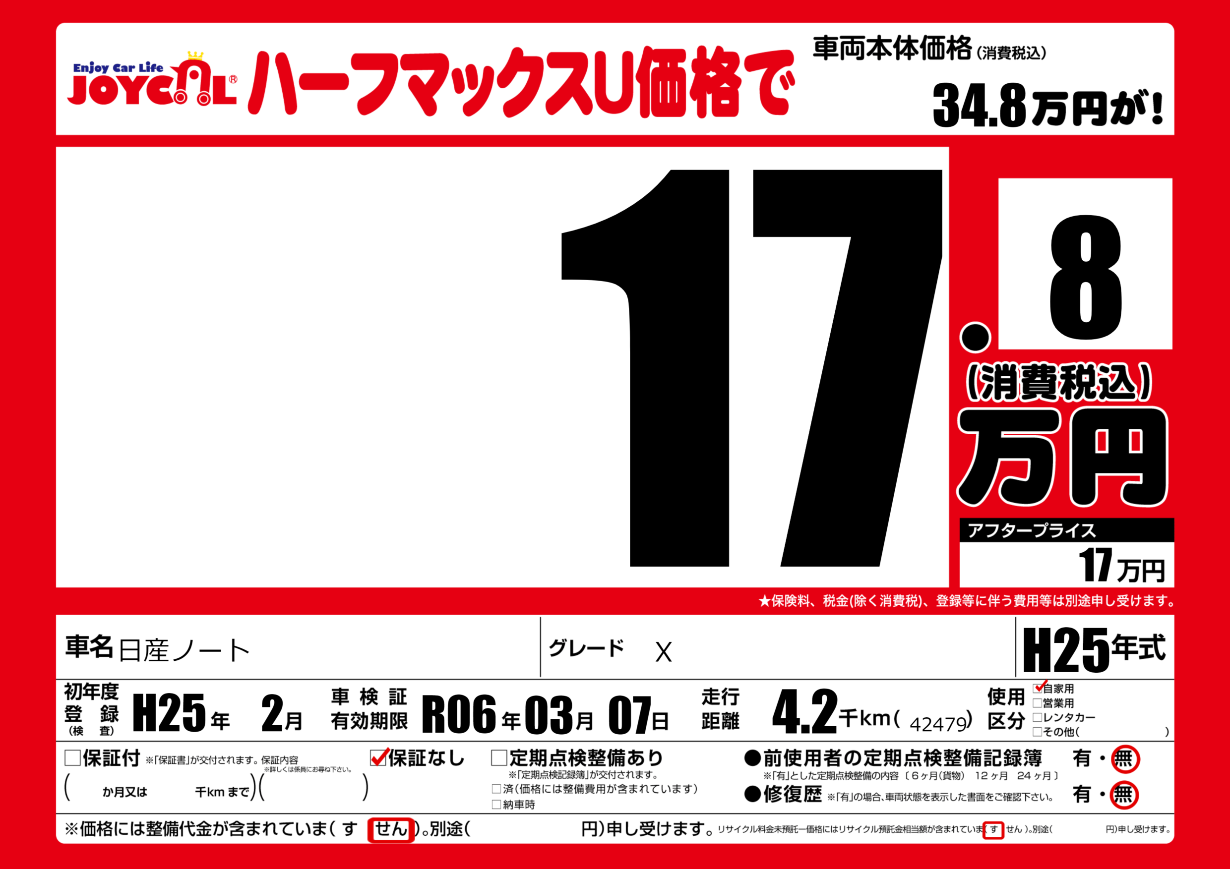 | 走行キロ | 0.4万km | 初年度登録 | H25年2月 |
