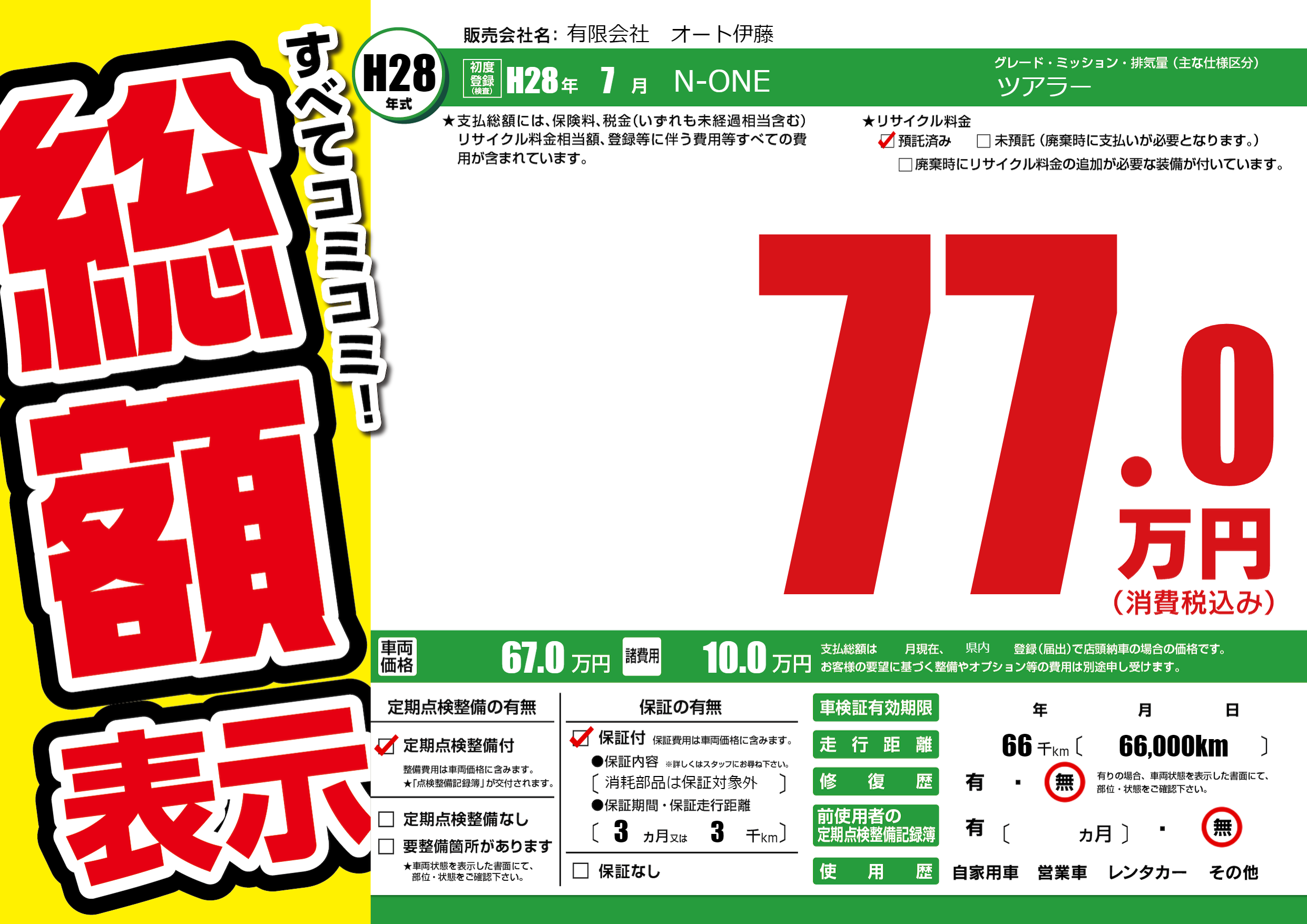 | 車名 | N-ONE | グレード ミッション 排気量 |