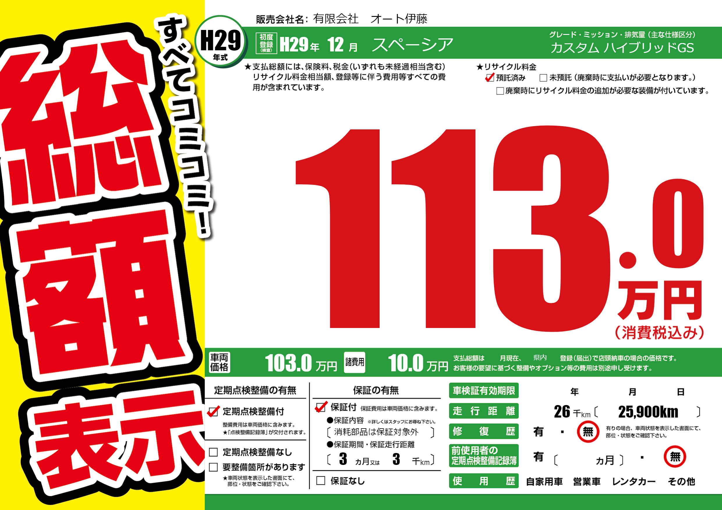| 車名 | スペーシア | グレード ミッション 排気量 |