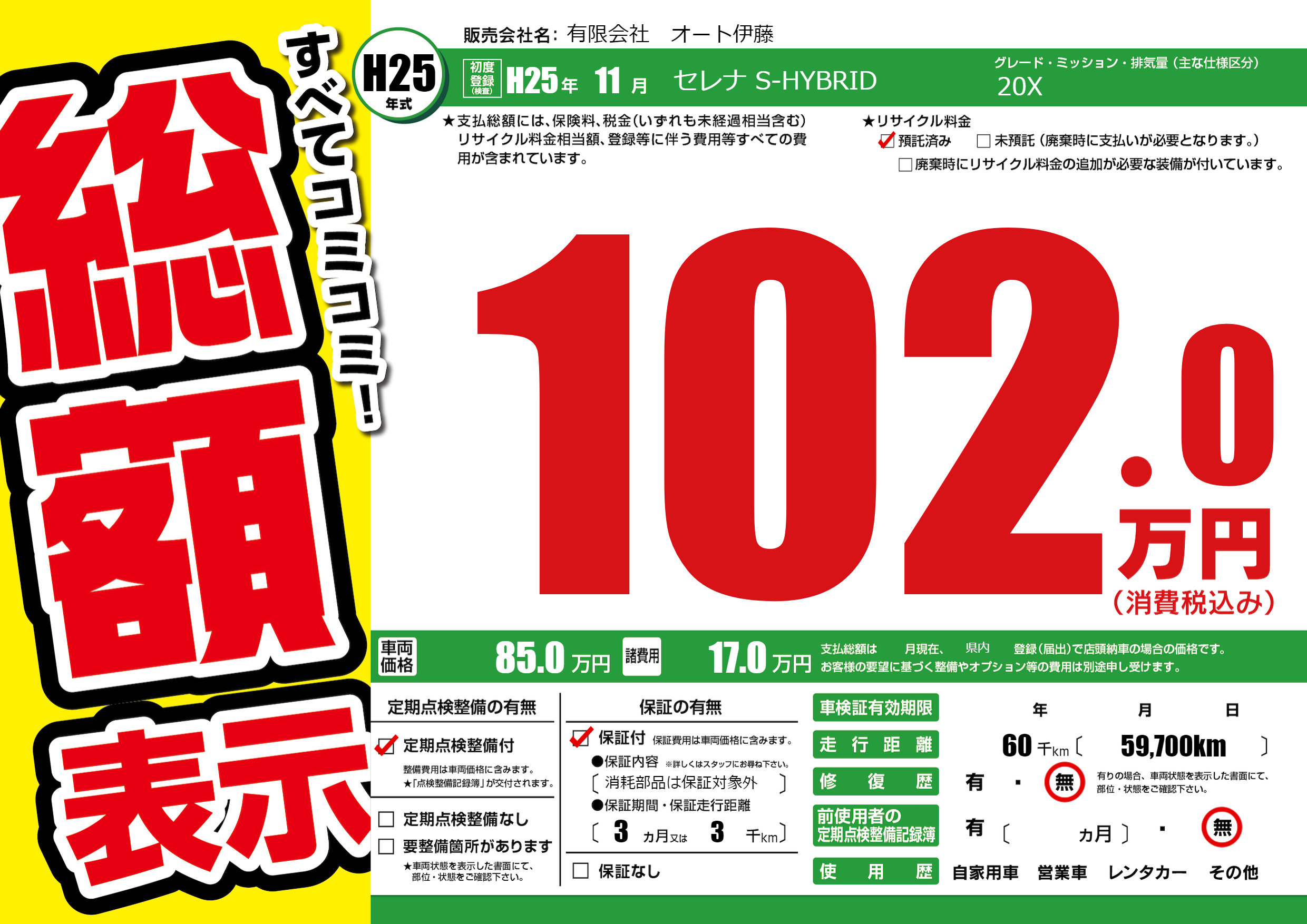 | 車名 | セレナ S-HYBRID | グレード ミッション 排気量 |