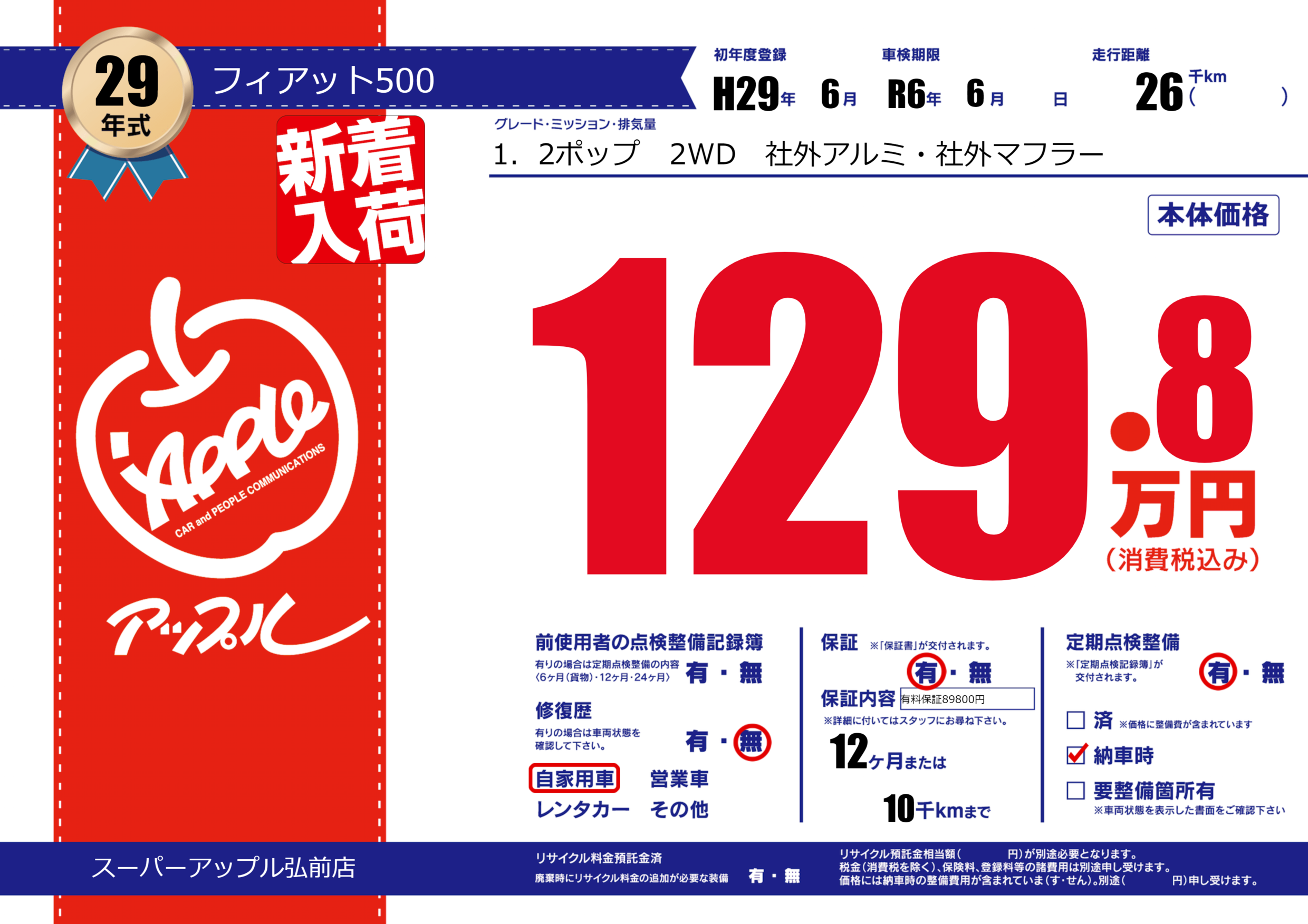 | 車名 | フィアット500 | グレード ミッション 排気量 |
