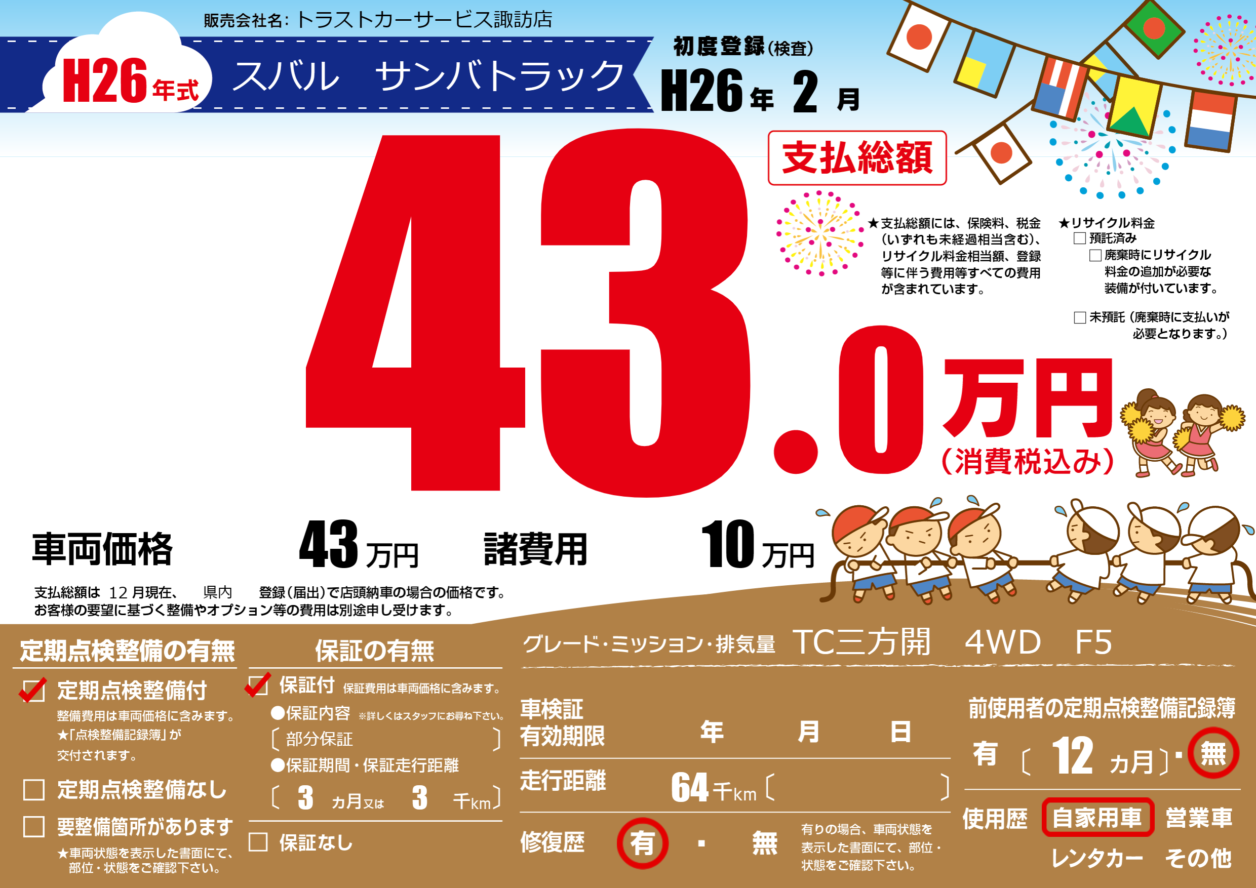 | 車名 | スバル サンバトラック | グレード ミッション 排気量 |