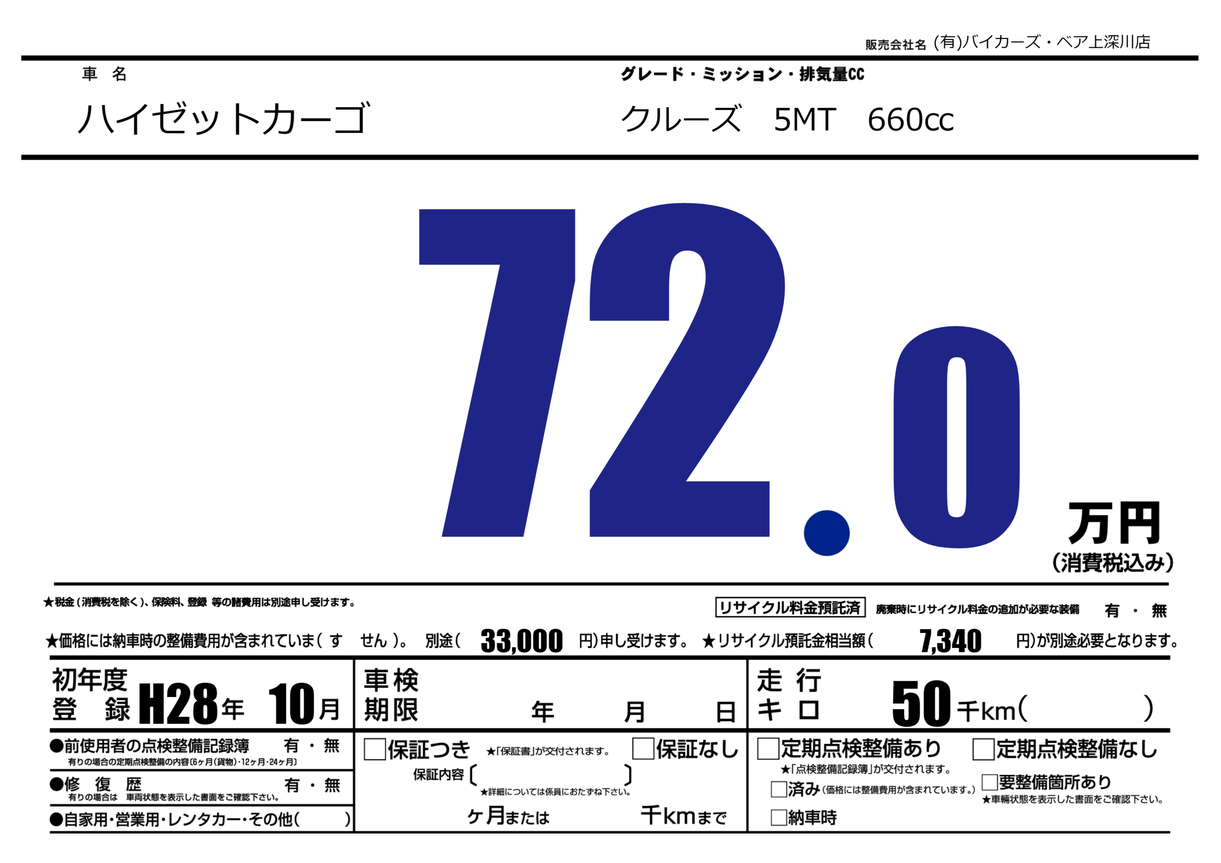 | 車名 | ハイゼットカーゴ | グレード ミッション 排気量 |