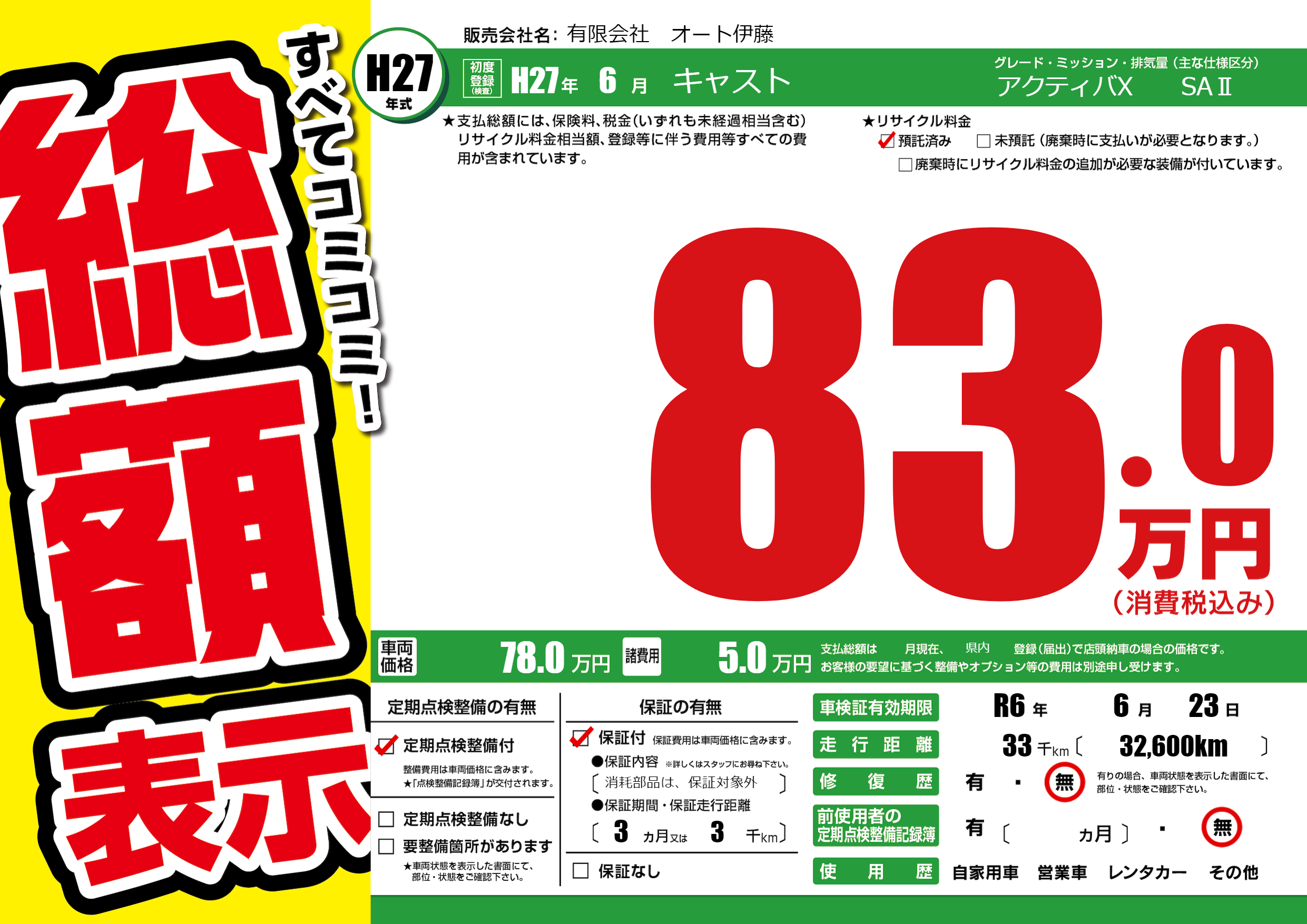 | 走行キロ | 3.3万km | 初年度登録 | H27年6月 |