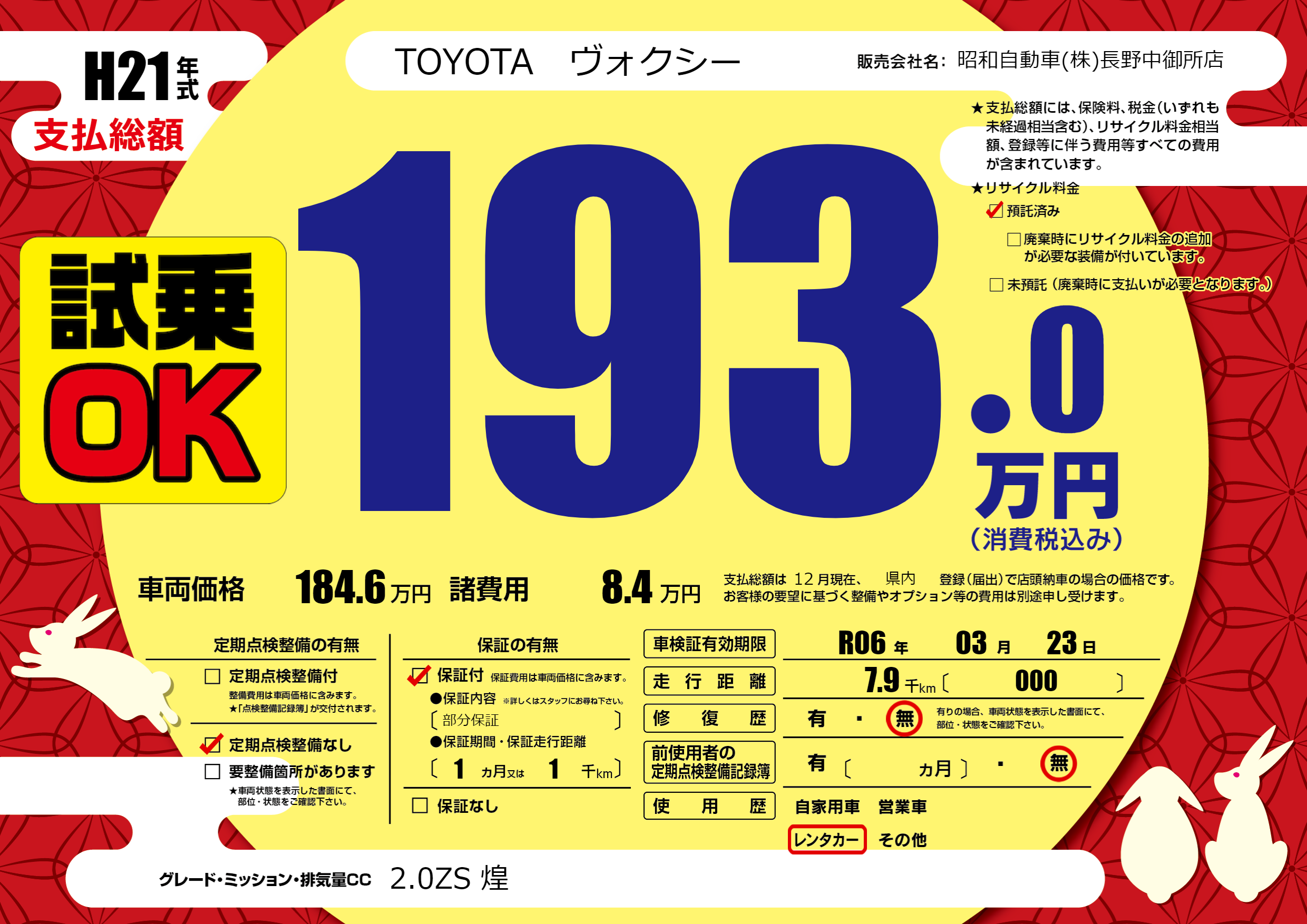 | 車名 | TOYOTA ヴォクシー | グレード ミッション 排気量 |