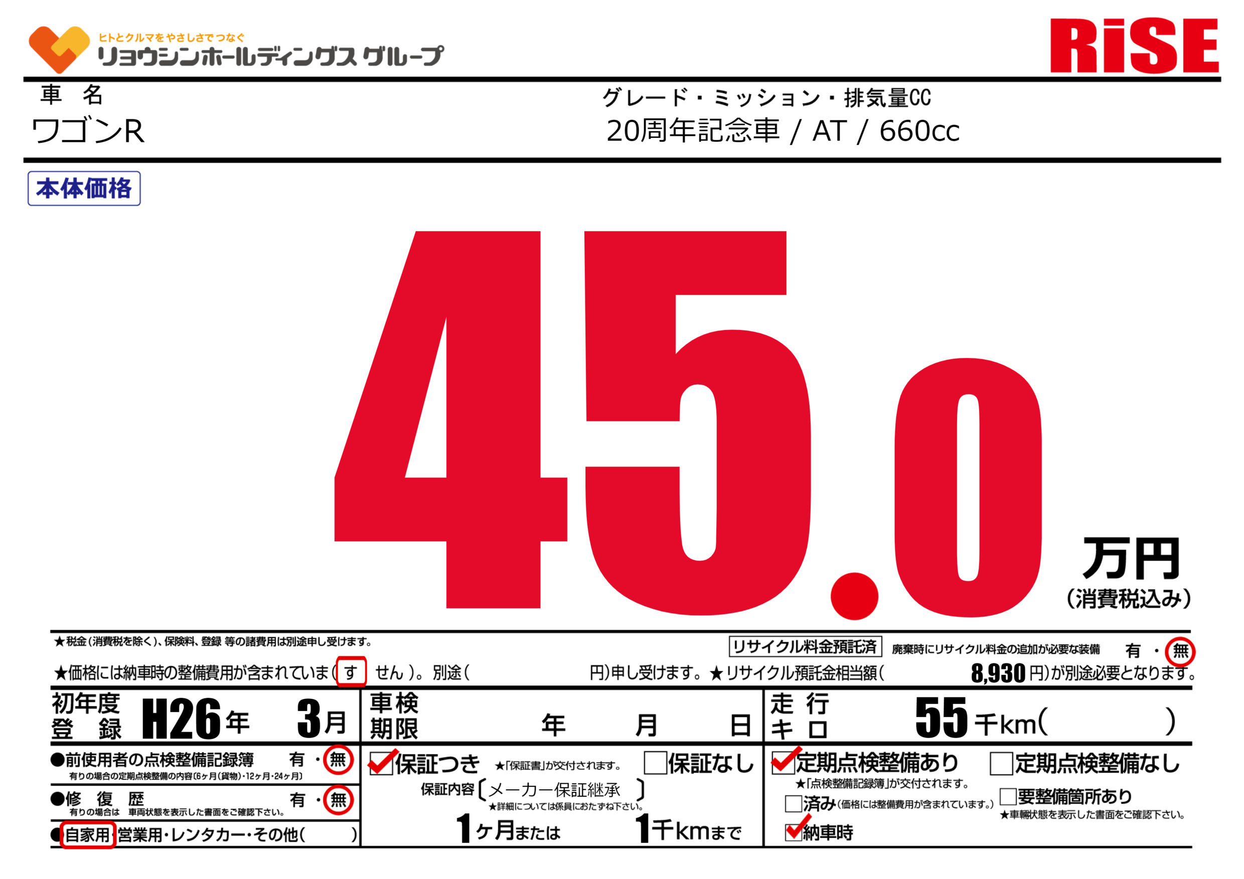 | 車名 | ワゴンR | グレード ミッション 排気量 |