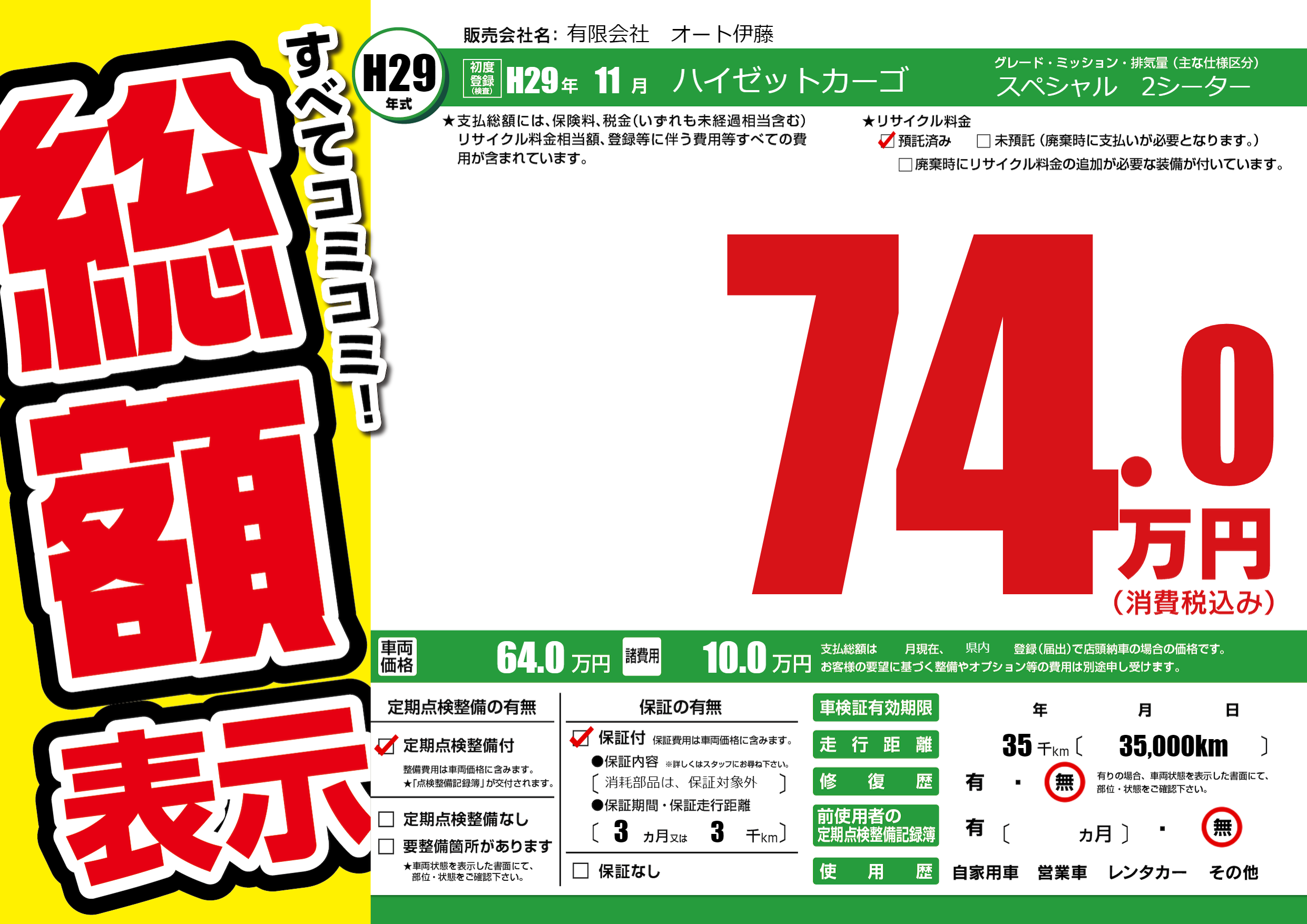保証付き 保証内容(消耗部品は、保証対象外) 3ヶ月または(3)千kmまで |