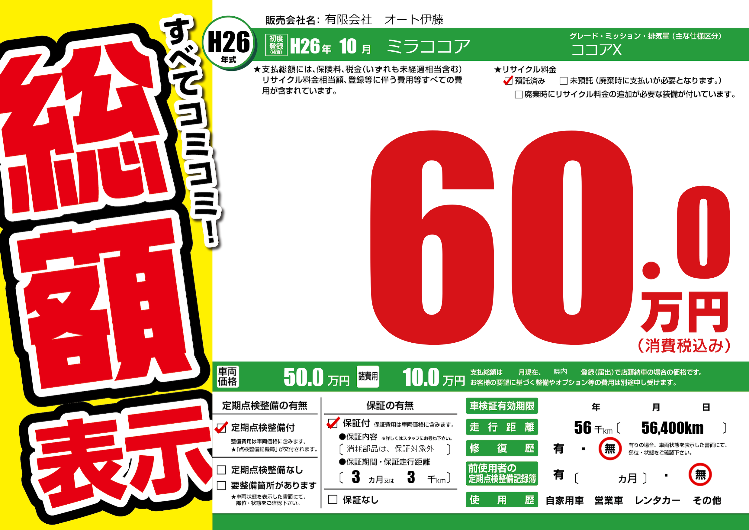 保証付き 保証内容(消耗部品は、保証対象外) 3ヶ月または3千km |
