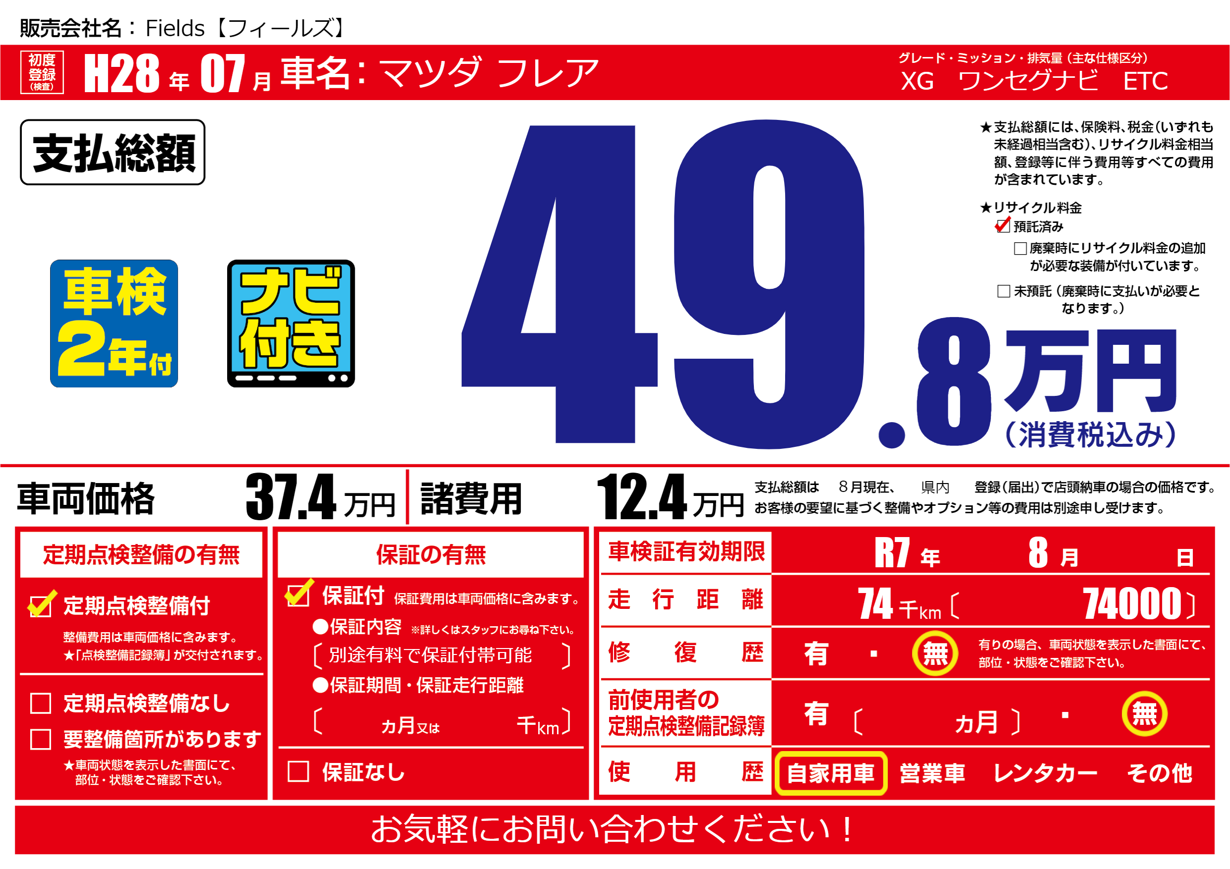 | 走行キロ | 7.4万km | 初年度登録 | H28年07月 |