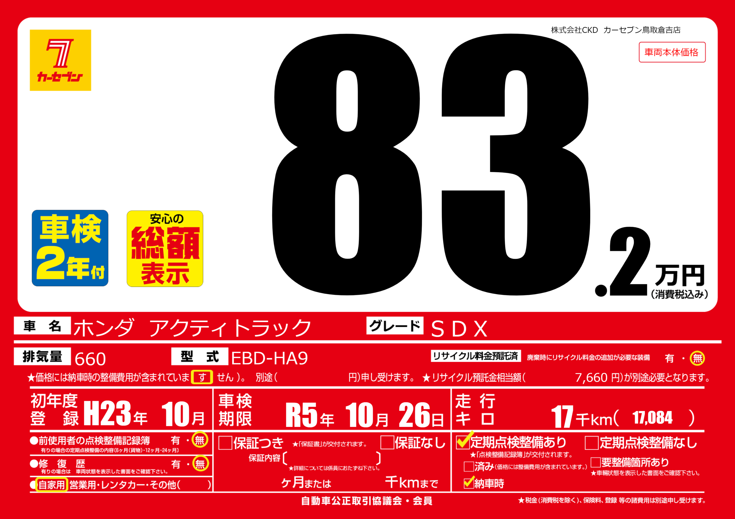 | 車名 | ホンダ アクティトラック | グレード ミッション 排気量 |