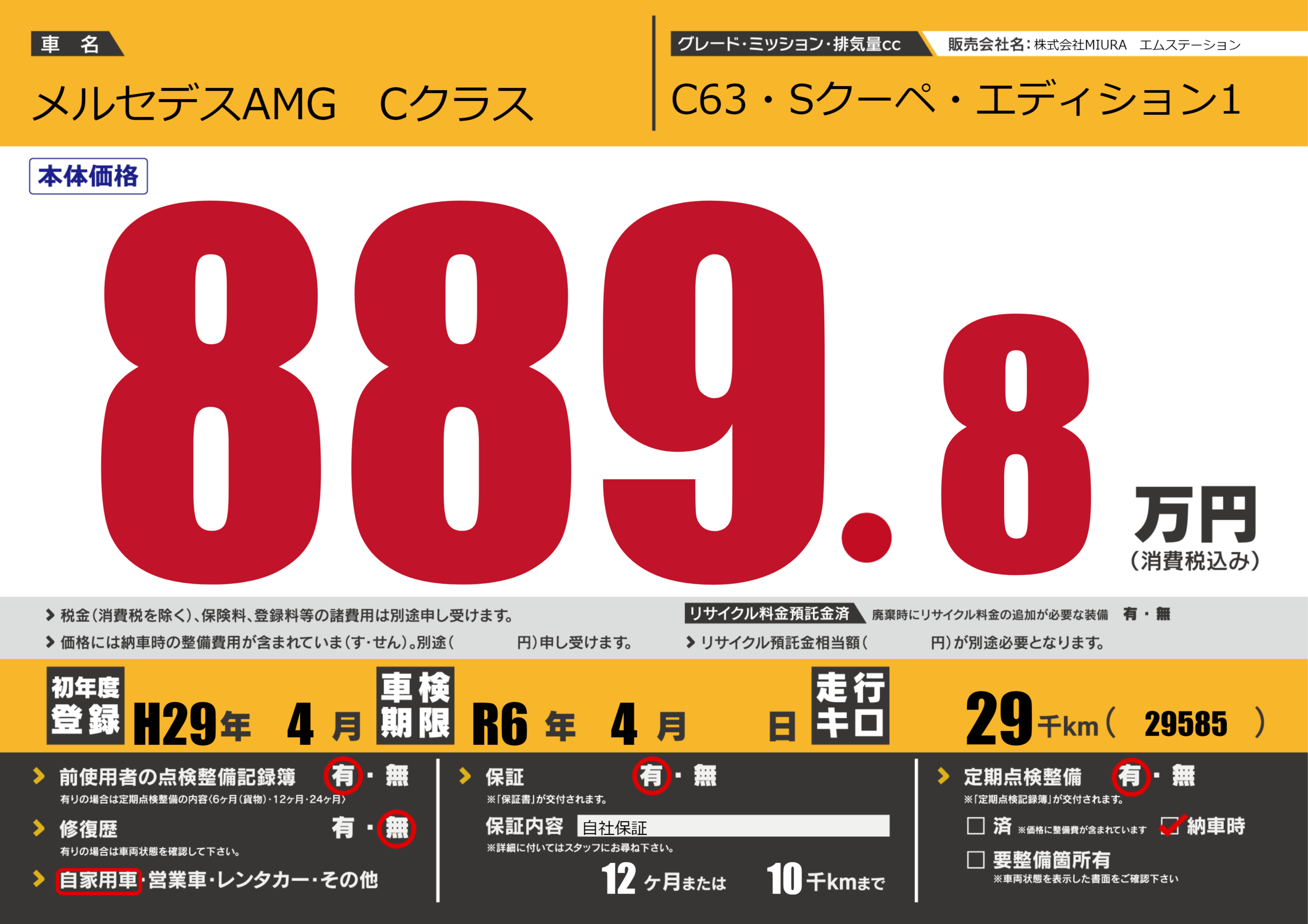 | 車名 | メルセデスAMG Cクラス | グレード ミッション 排気量 |