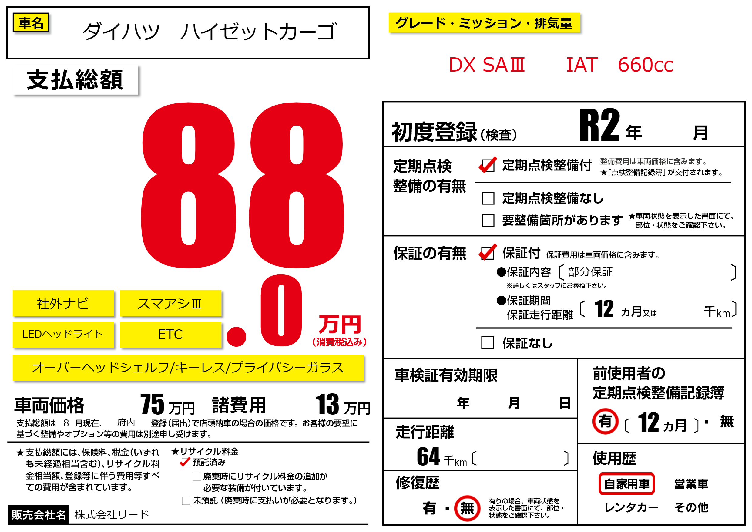 | 車名 | ダイハツ ハイゼットカーゴ | グレード ミッション 排気量 |