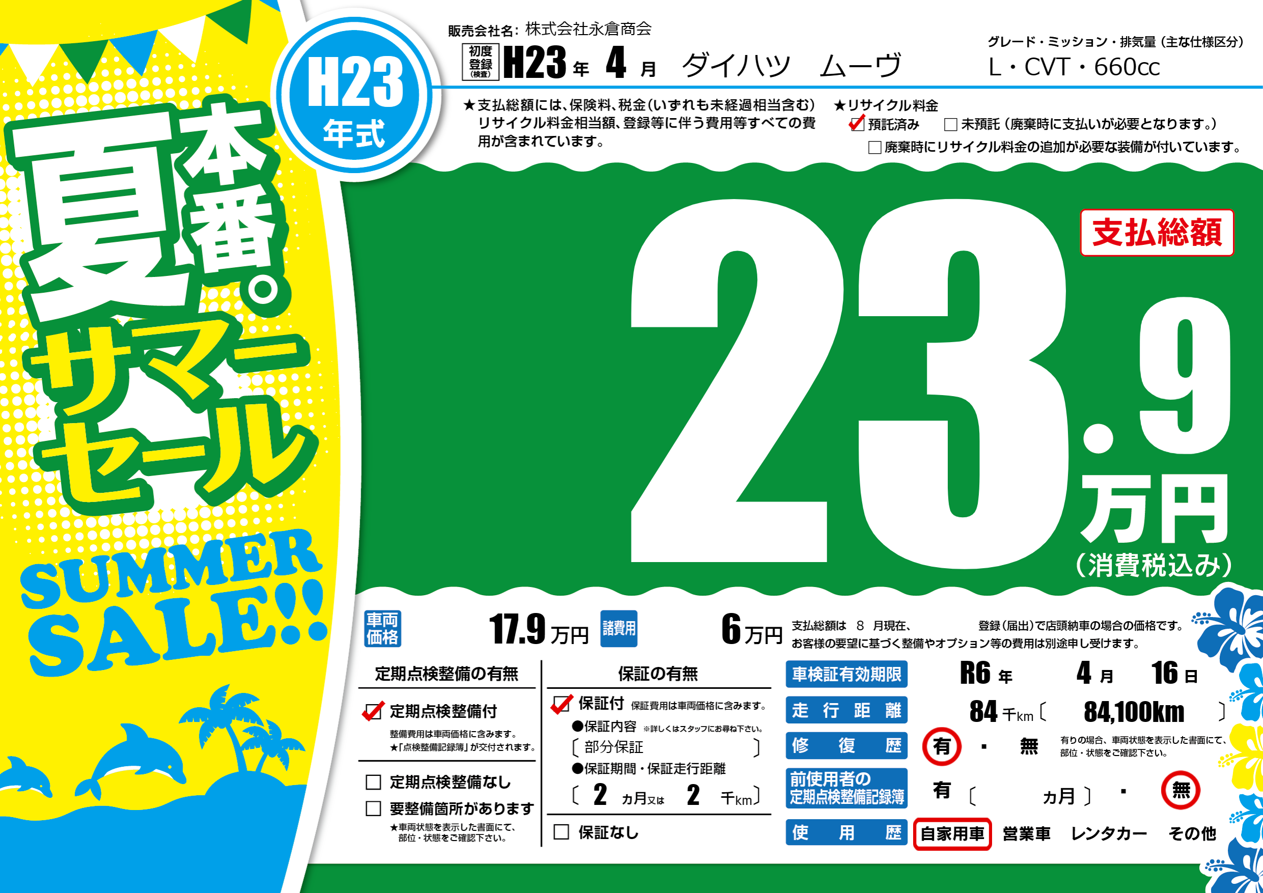 | 走行キロ | 8.4万km | 初年度登録 | H23年4月 |