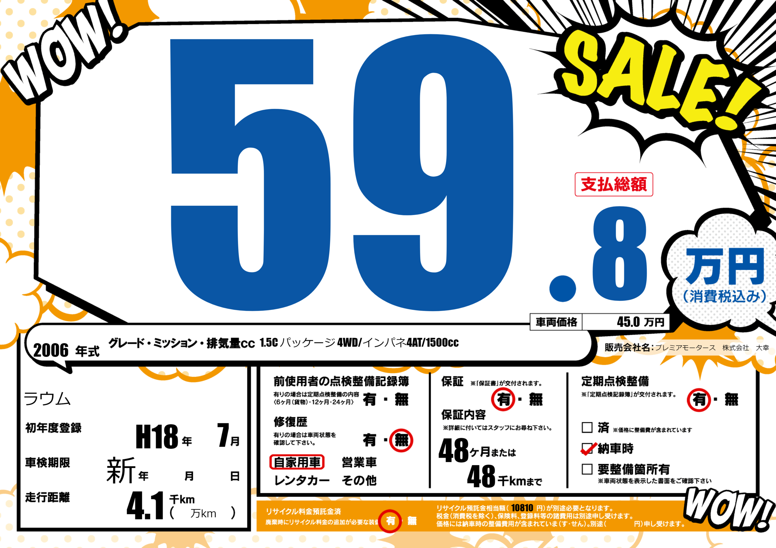 | 走行キロ | 0.4万km | 初年度登録 | H18年7月 |