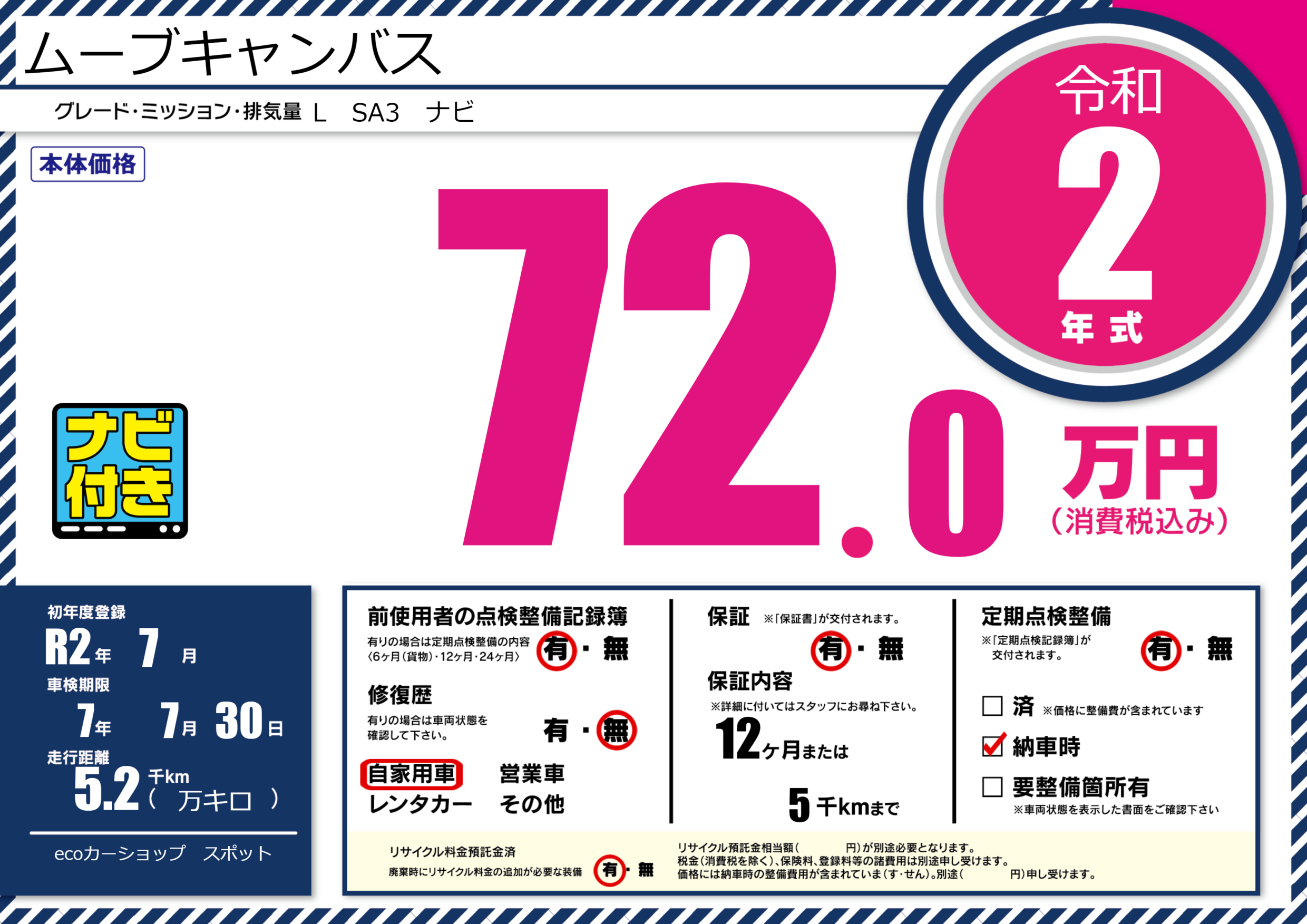 | 車名 | ムーブキャンバス | グレード ミッション 排気量 |