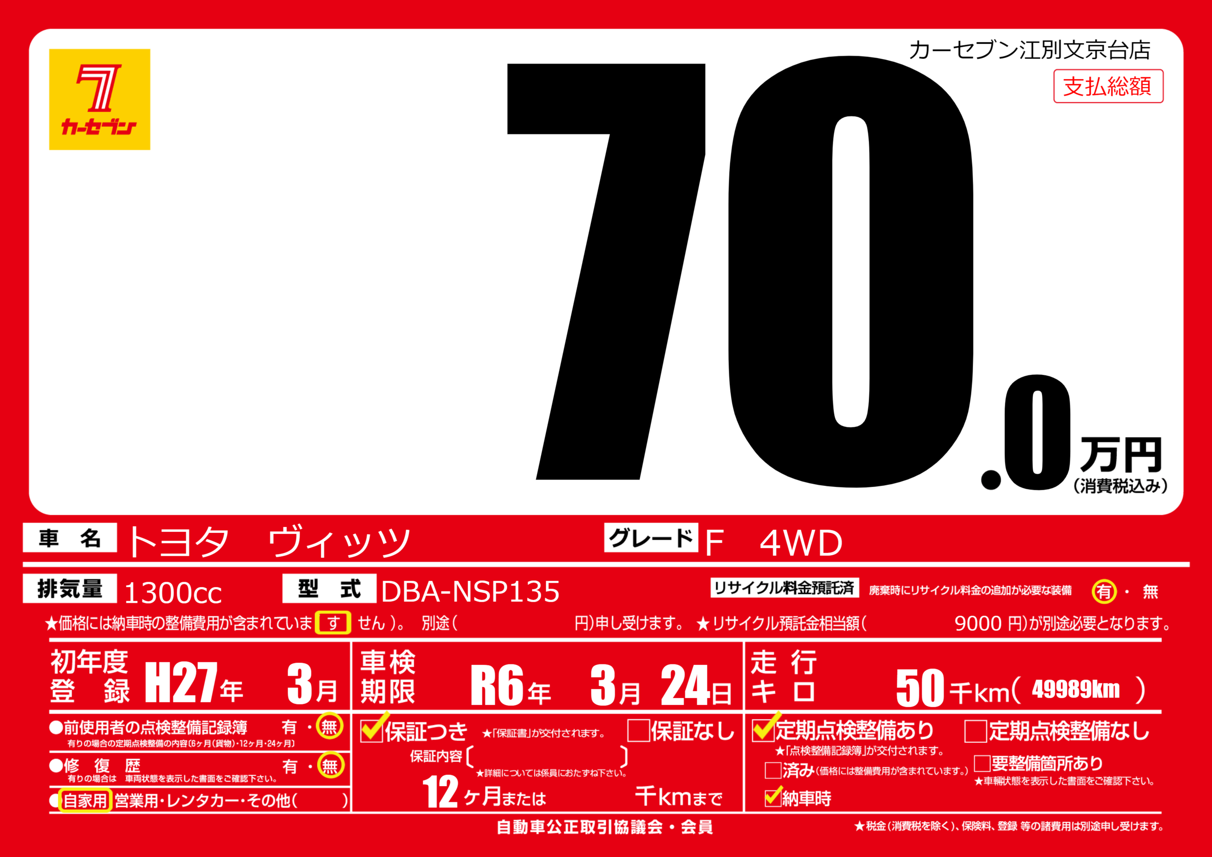 | 車名 | トヨタ ヴィッツ | グレード ミッション 排気量 |