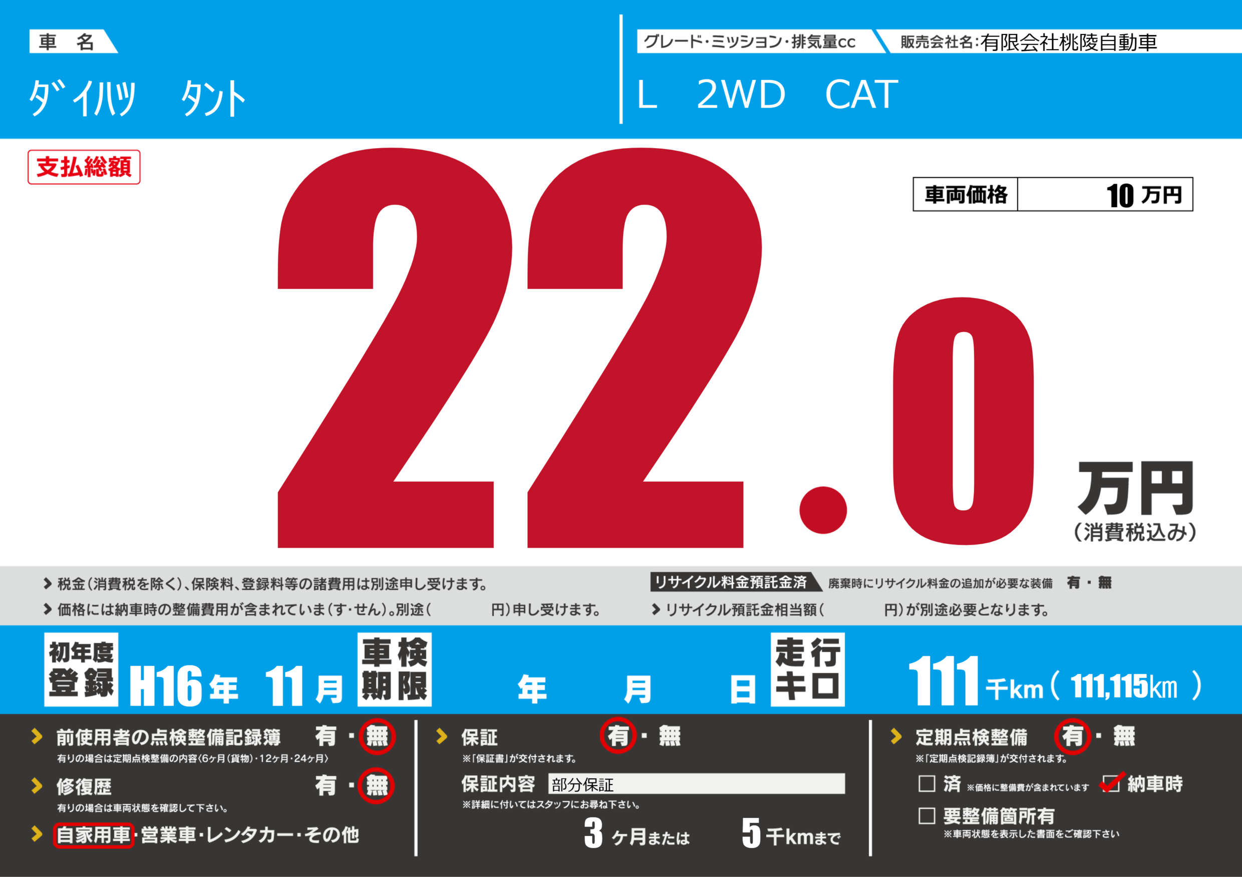 | 定期点検整備 | 定期点検整備あり 納車時あり | ||