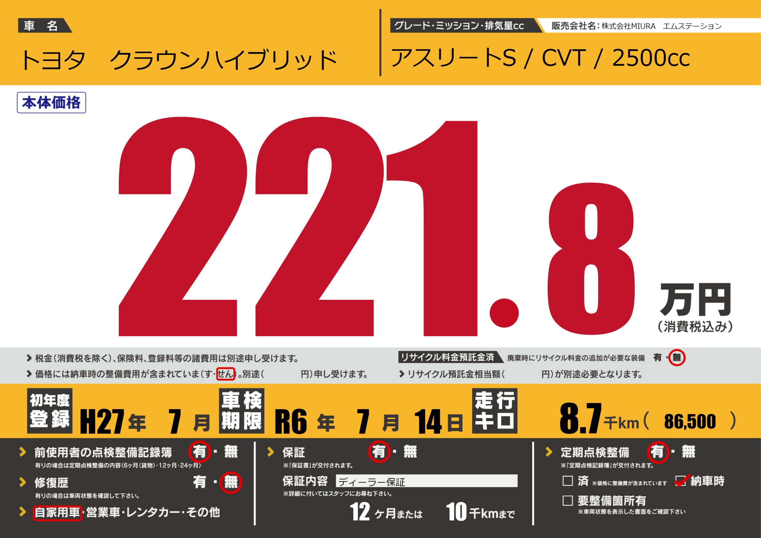 保証付き 保証内容(ディーラー保証) 12ヶ月または(10)千kmまで |