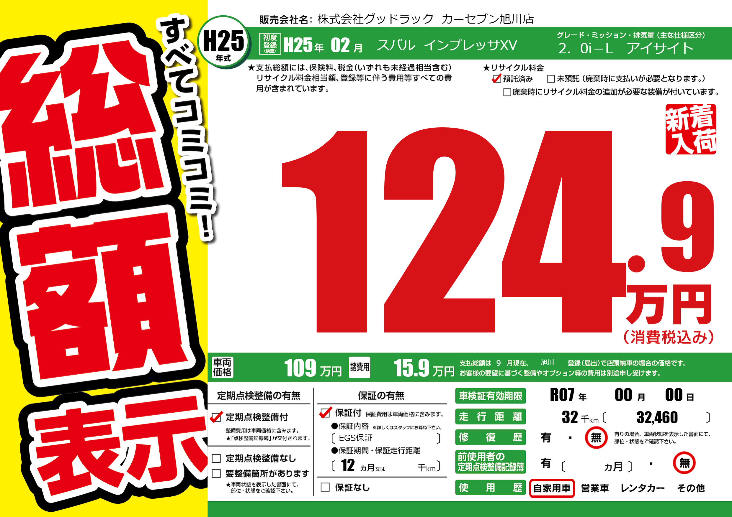 | 車名 | スバル インプレッサXV | グレード ミッション 排気量 |