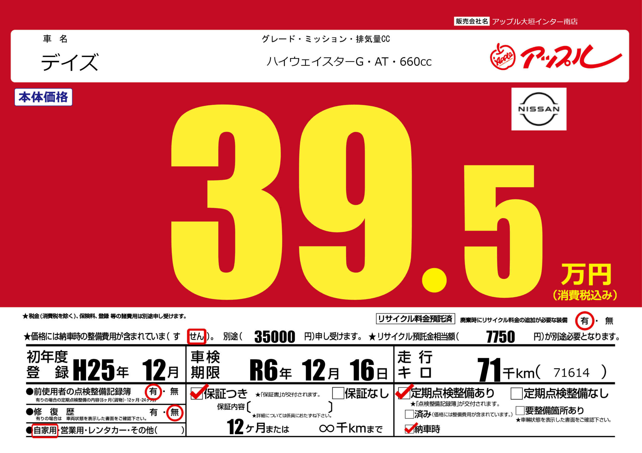 | 車名 | デイズ | グレード ミッション 排気量 |
