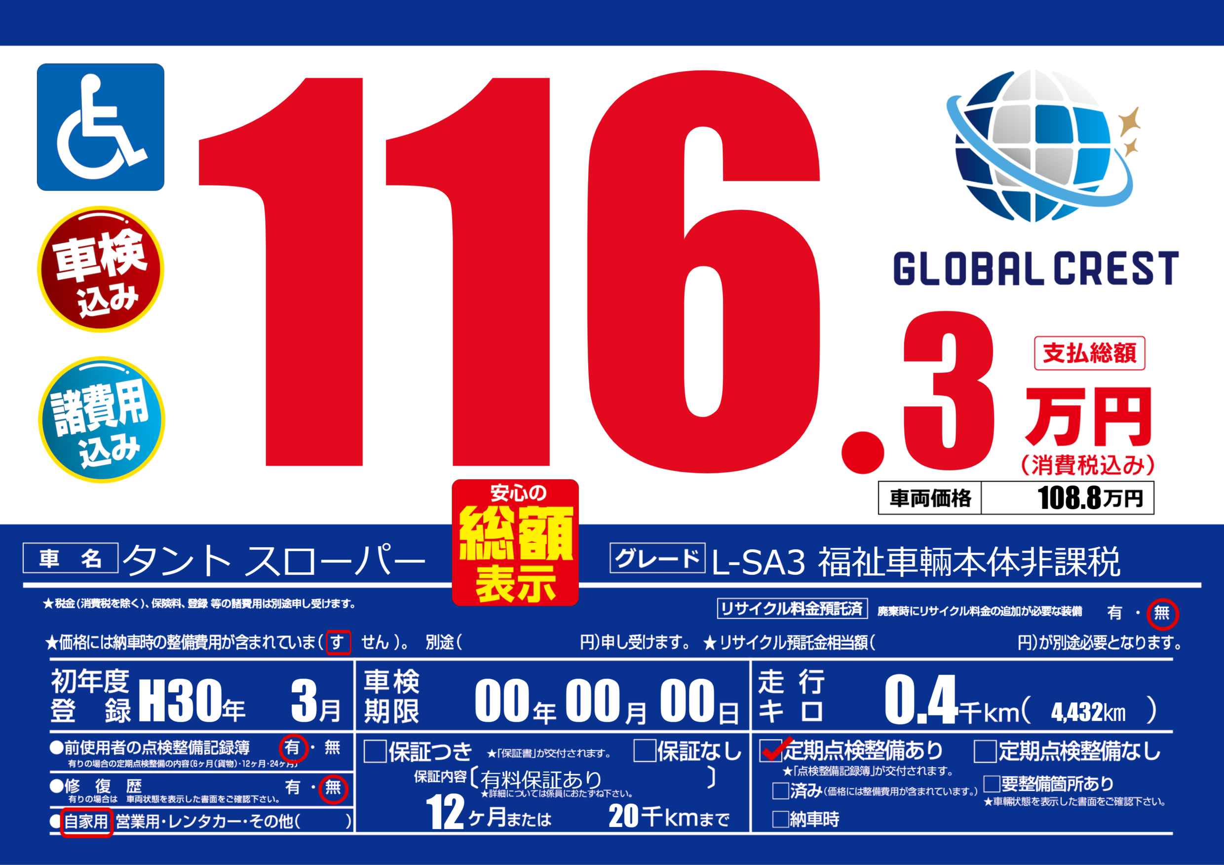 | 車名 | タント スローパー | グレード ミッション 排気量 |