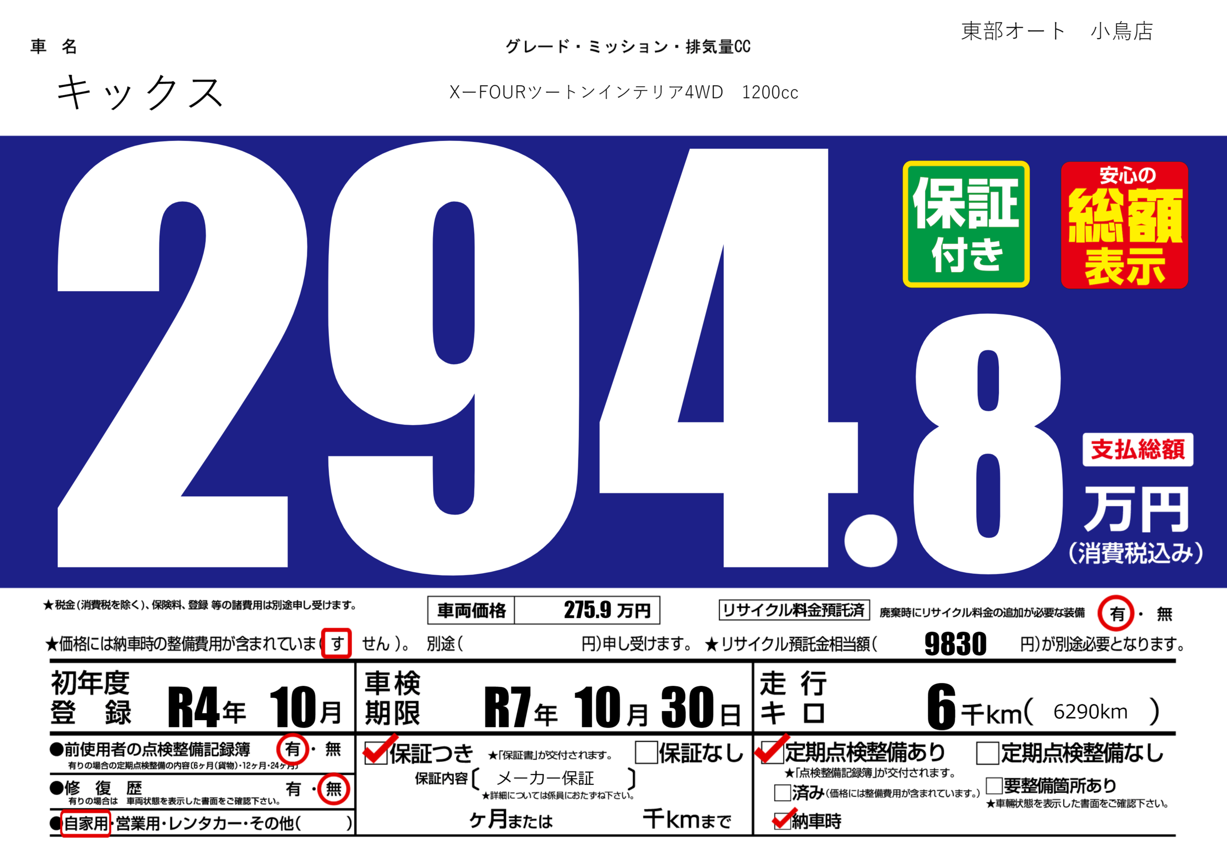 保証付き 保証内容( メーカー保証) ---ヶ月または()千kmまで |
