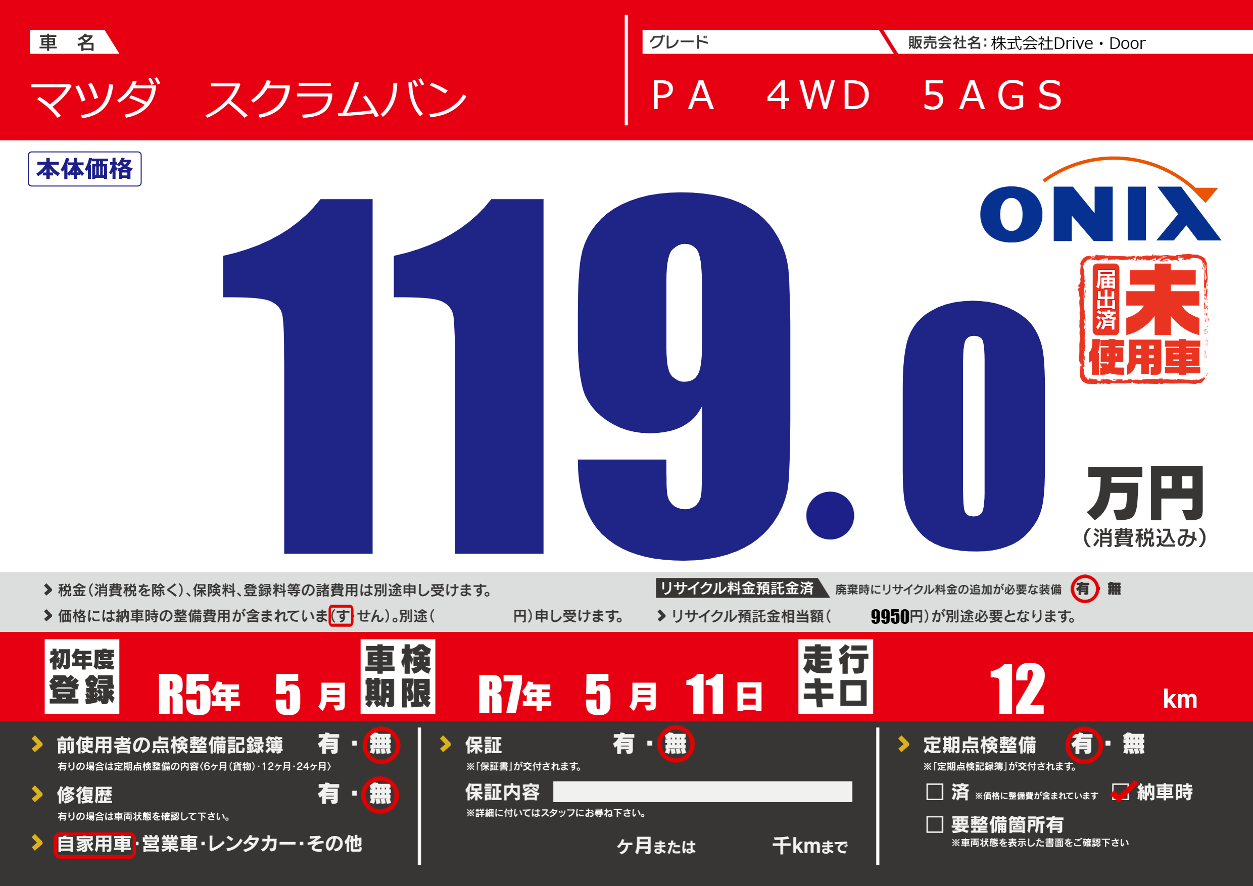 | 走行キロ | 1.2万km | 初年度登録 | R5年5月 |
