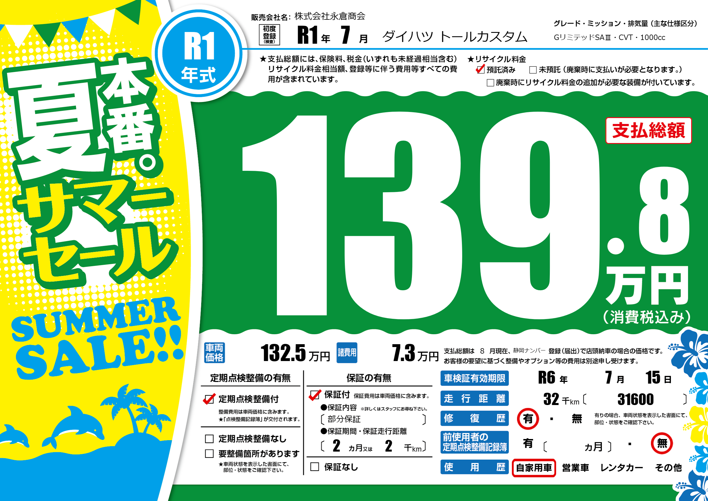 | 走行キロ | 3.2万km | 初年度登録 | R1年7月 |