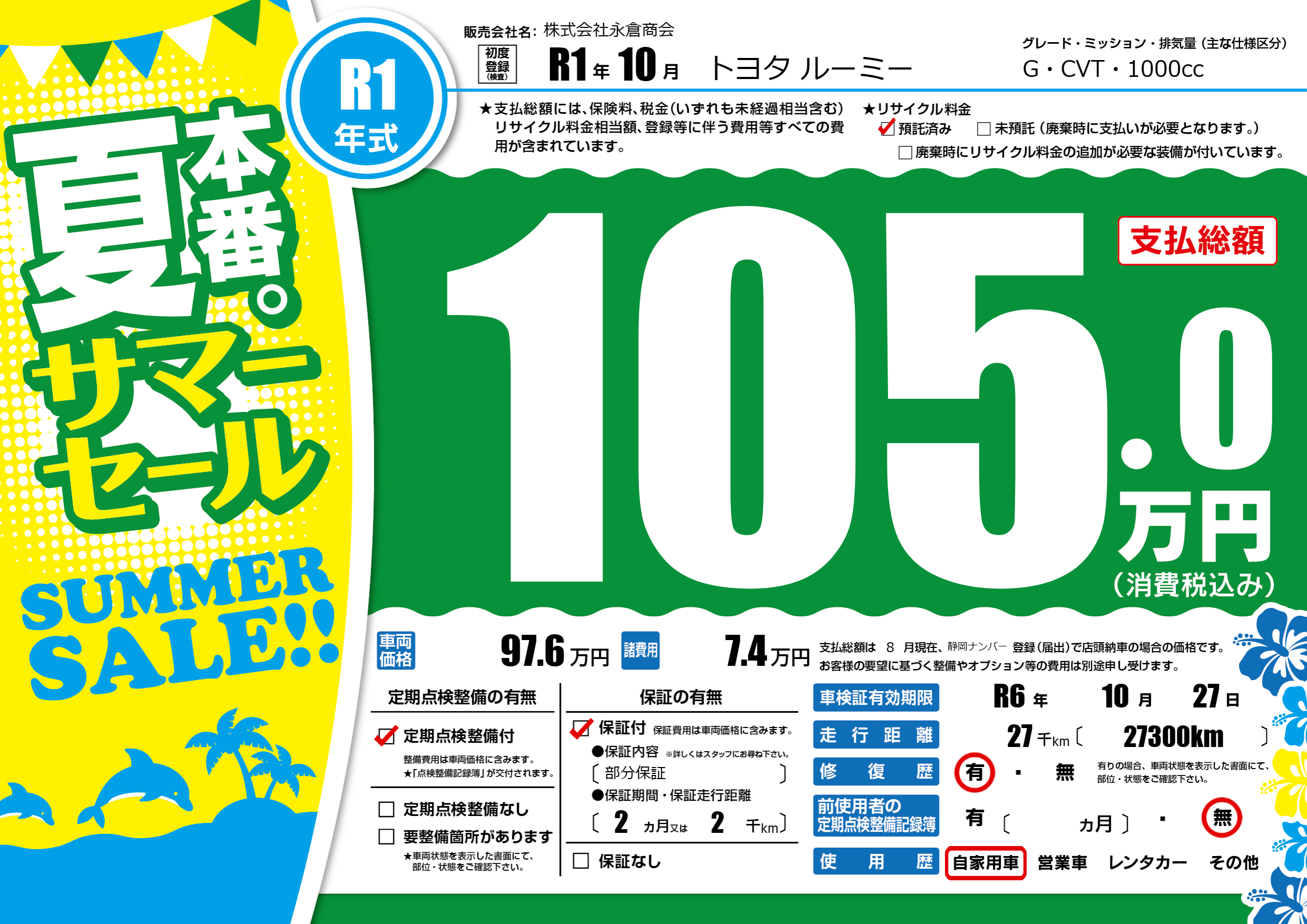 | 車名 | トヨタ ルーミー | グレード ミッション 排気量 |
