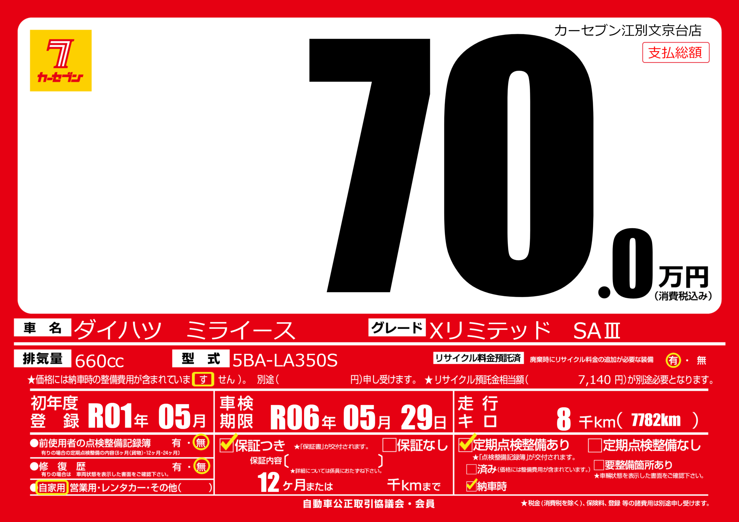| 車名 | ダイハツ ミライース | グレード ミッション 排気量 |