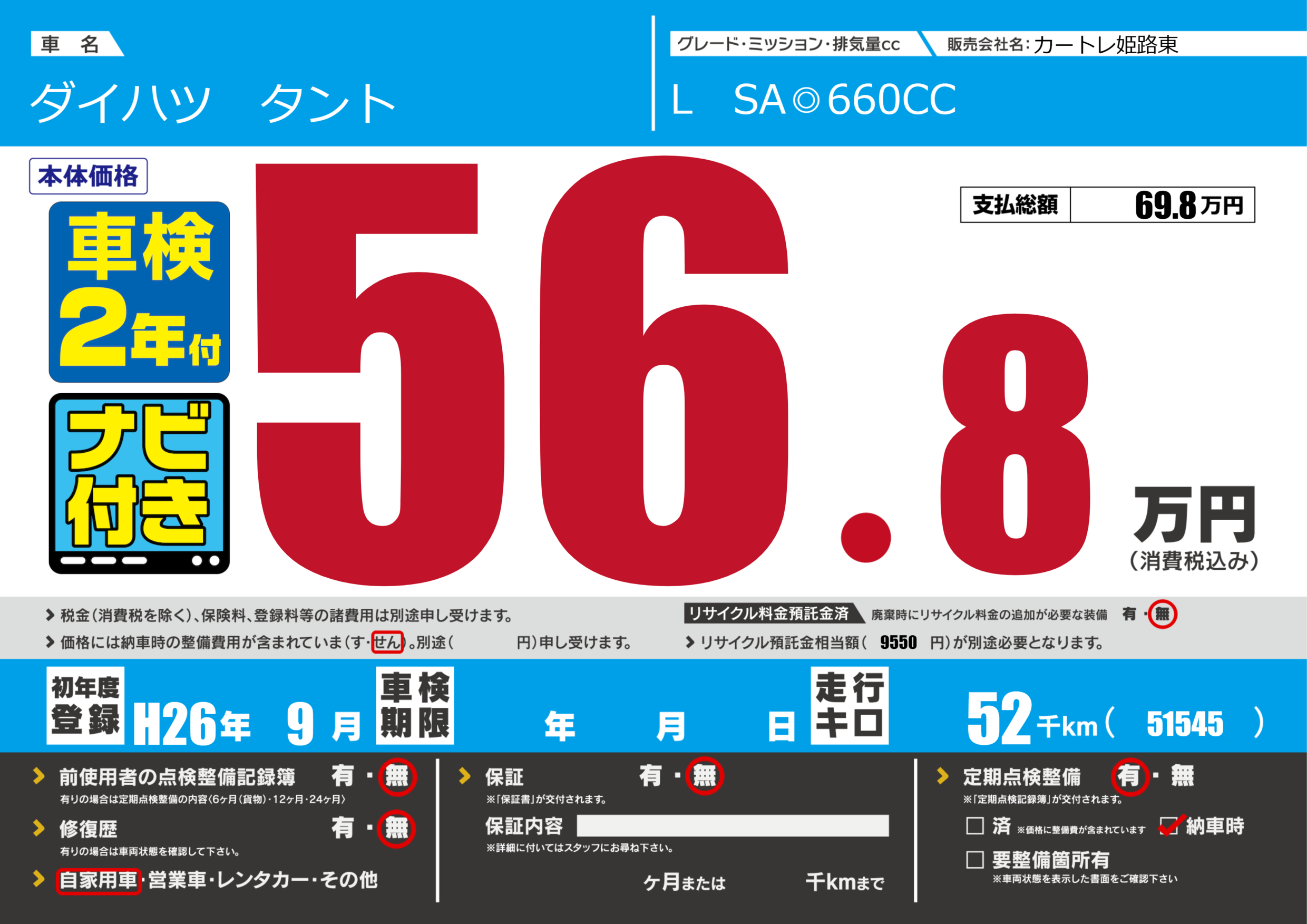 | 走行キロ | 5.2万km | 初年度登録 | H26年9月 |