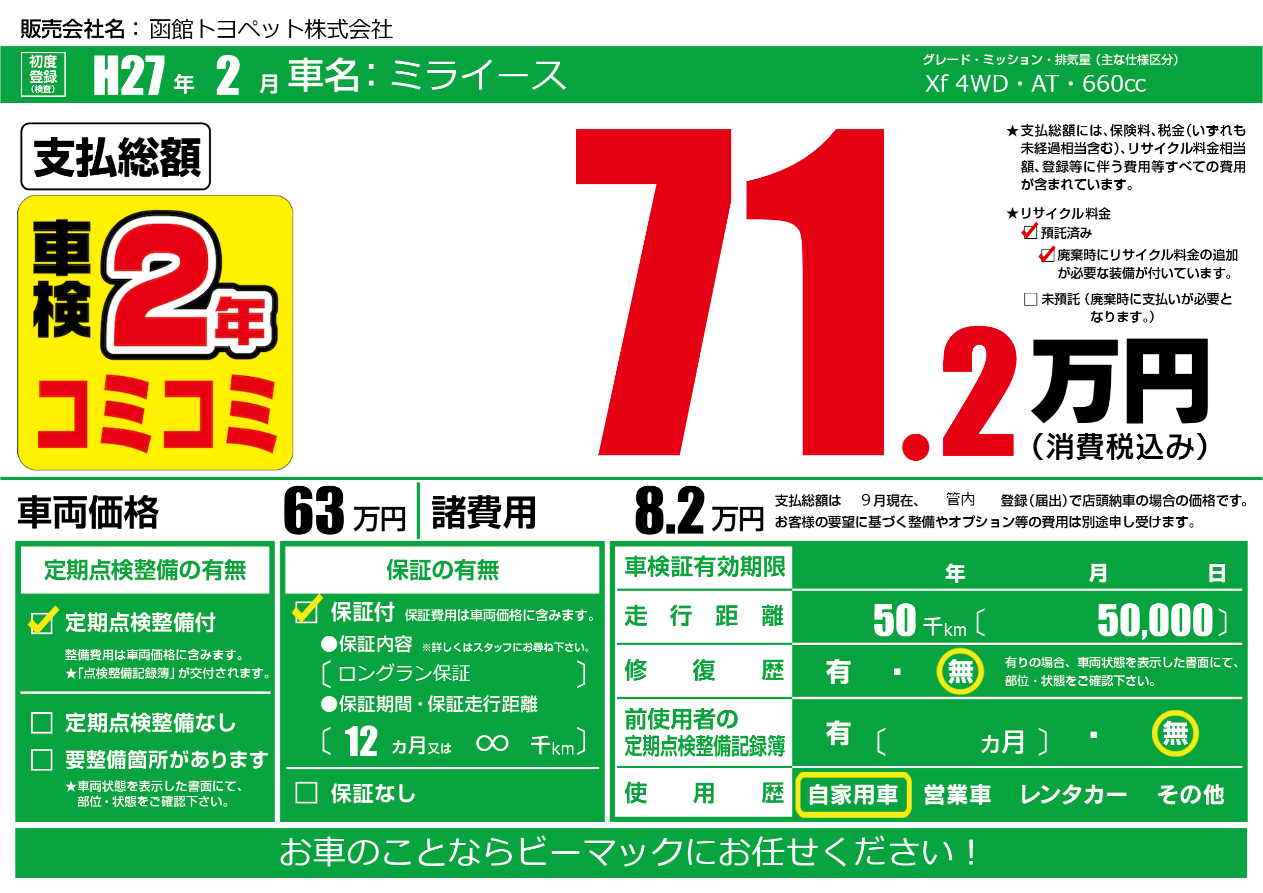 | 走行キロ | 5万km | 初年度登録 | H27年2月 |