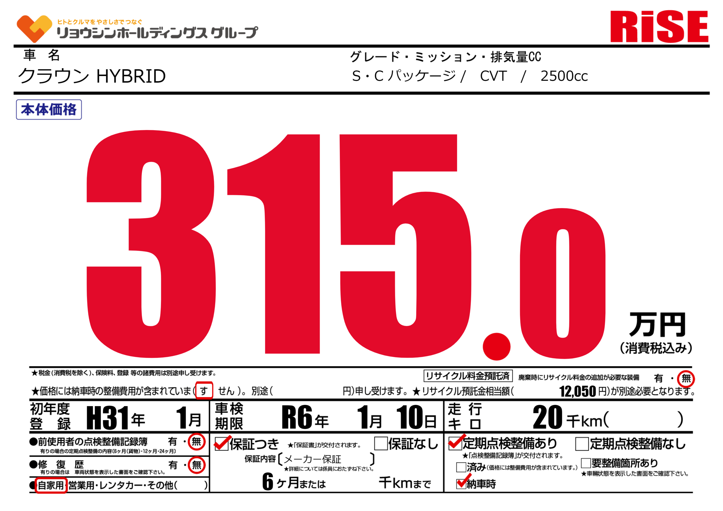 | 車名 | クラウン HYBRID | グレード ミッション 排気量 |
