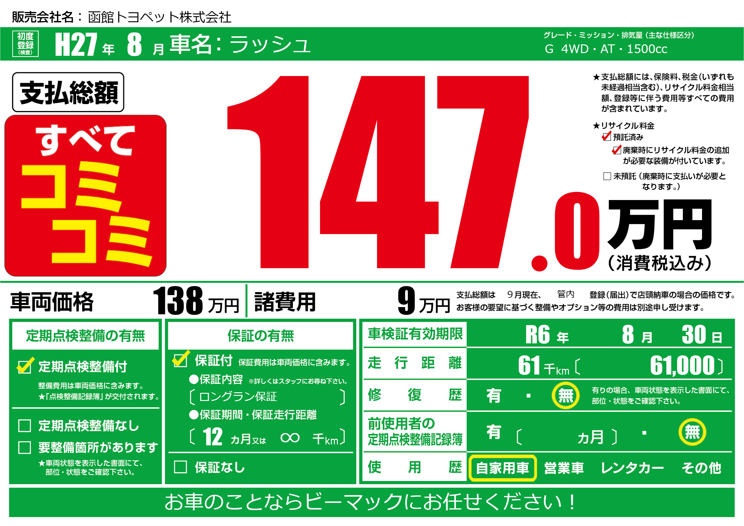 | 走行キロ | 6.1万km | 初年度登録 | H27年8月 |