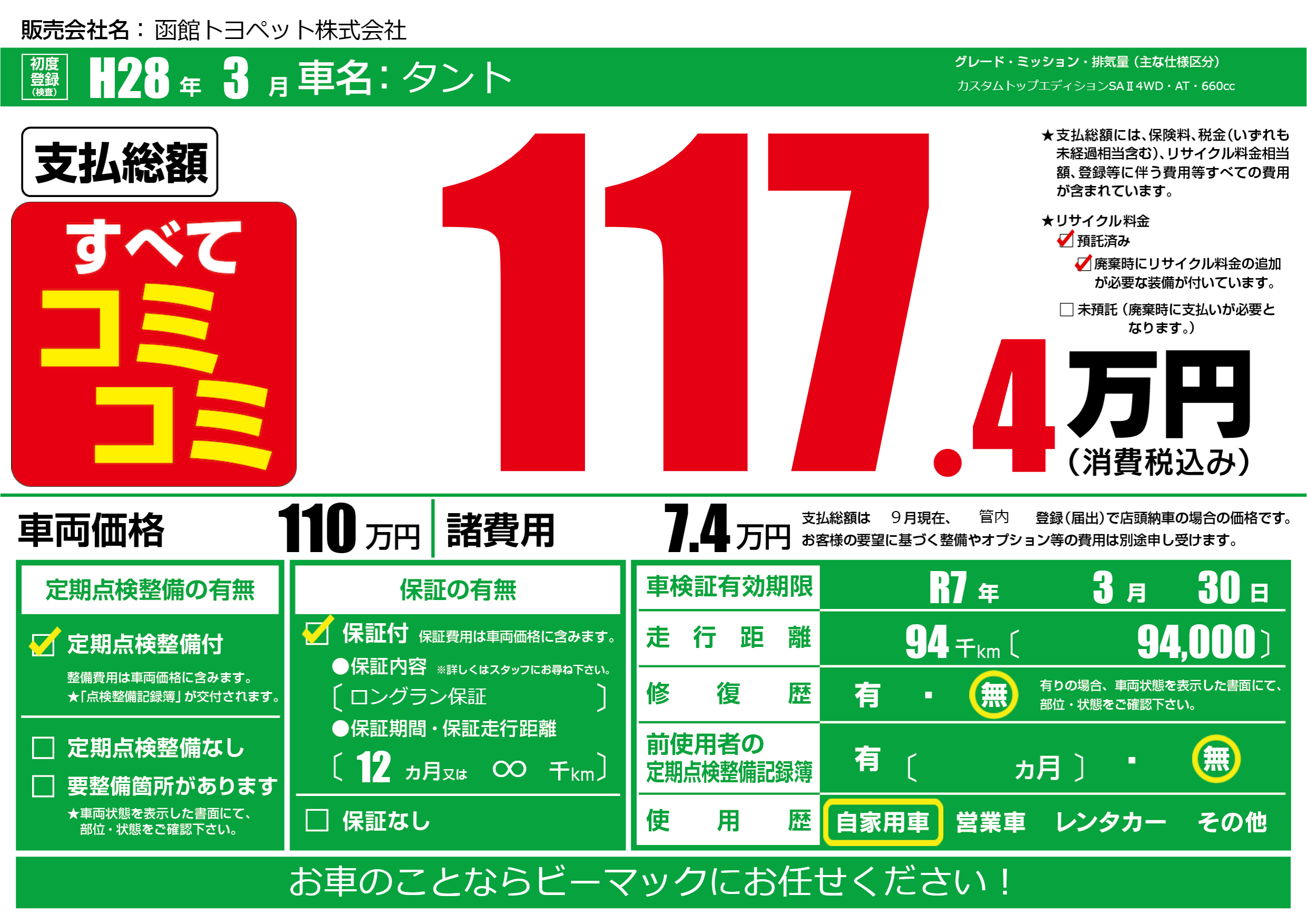 | 走行キロ | 9.4万km | 初年度登録 | H28年3月 |