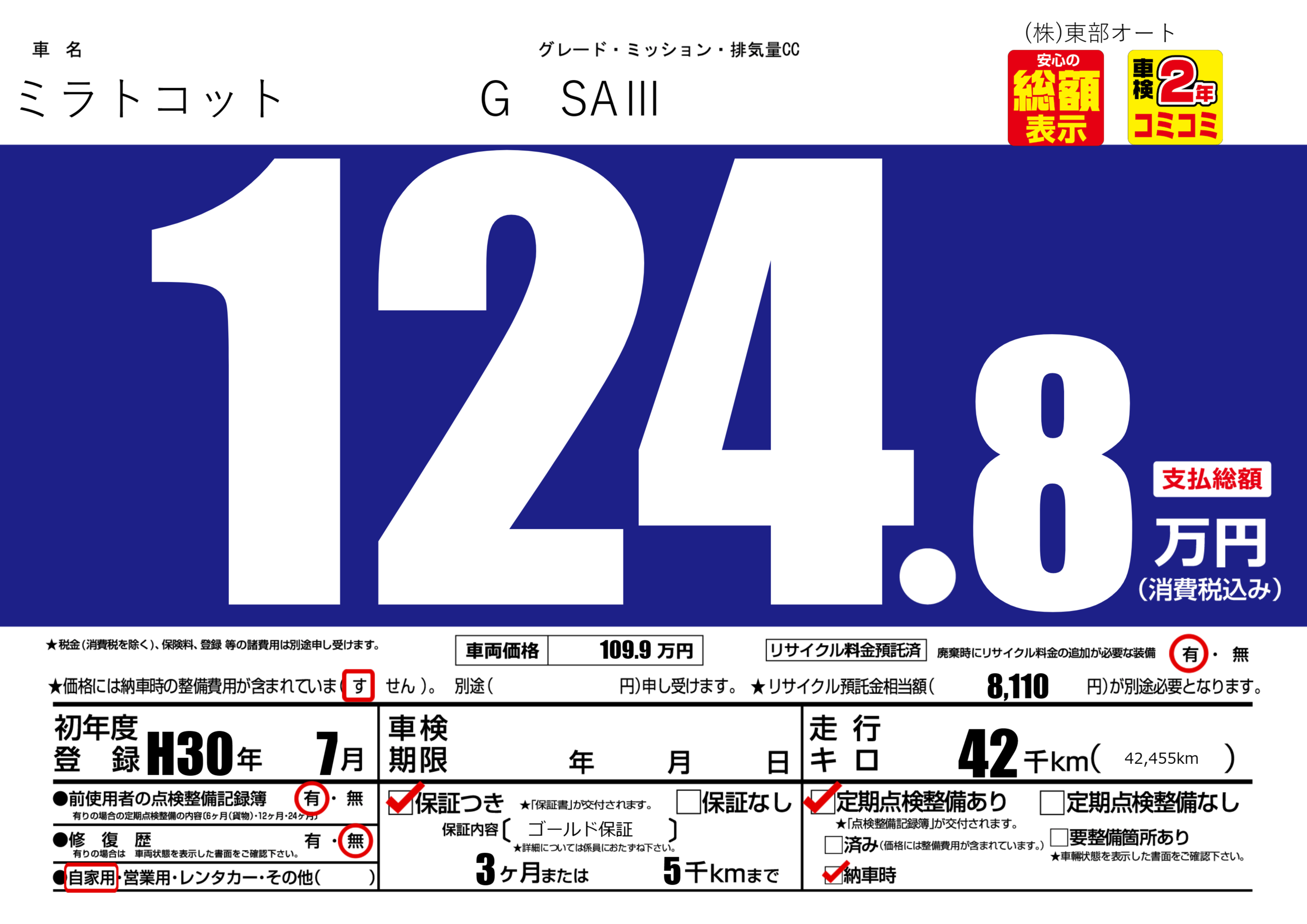 | 車名 | ミラトコット | グレード ミッション 排気量 |