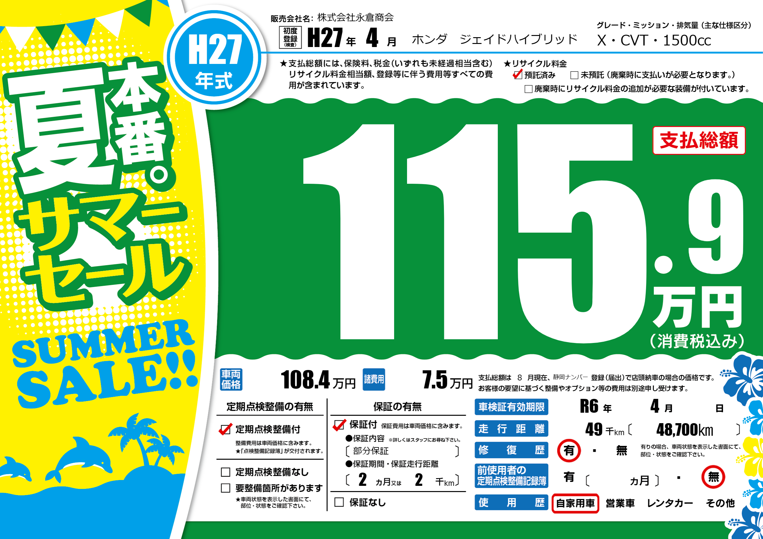 | 走行キロ | 4.9万km | 初年度登録 | H27年4月 |