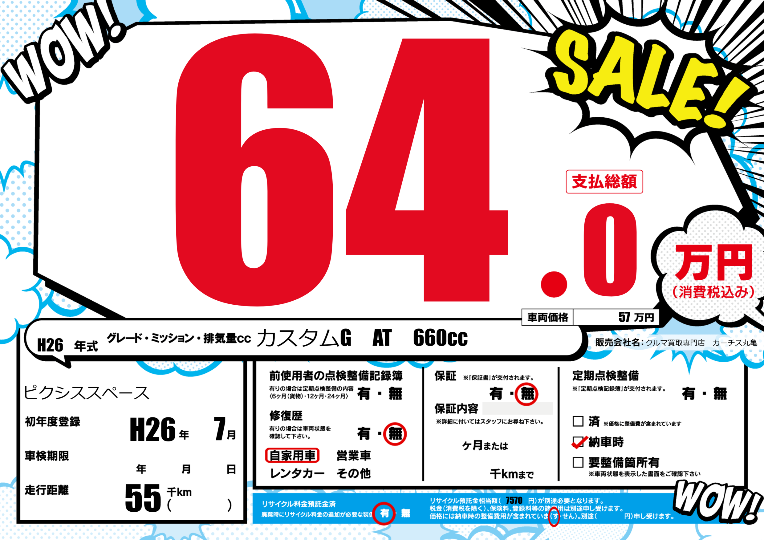 | 走行キロ | 5.5万km | 初年度登録 | H26年7月 |