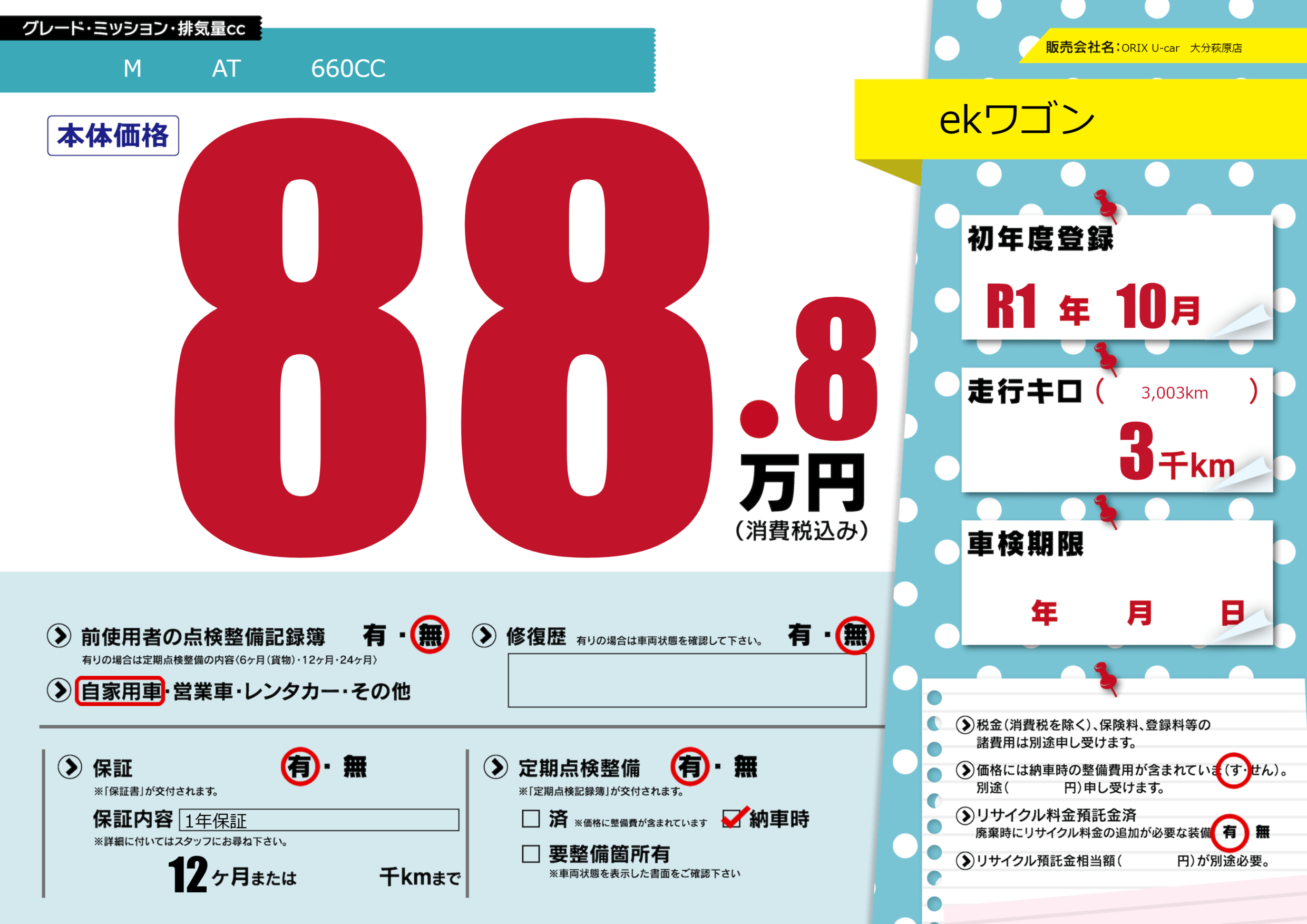 | 定期点検整備 | 定期点検整備あり 納車時あり | ||