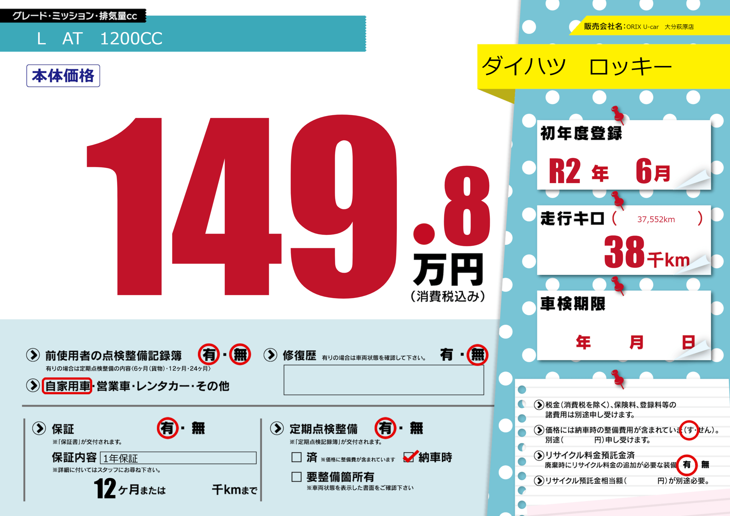 | 定期点検整備 | 定期点検整備あり 納車時あり | ||