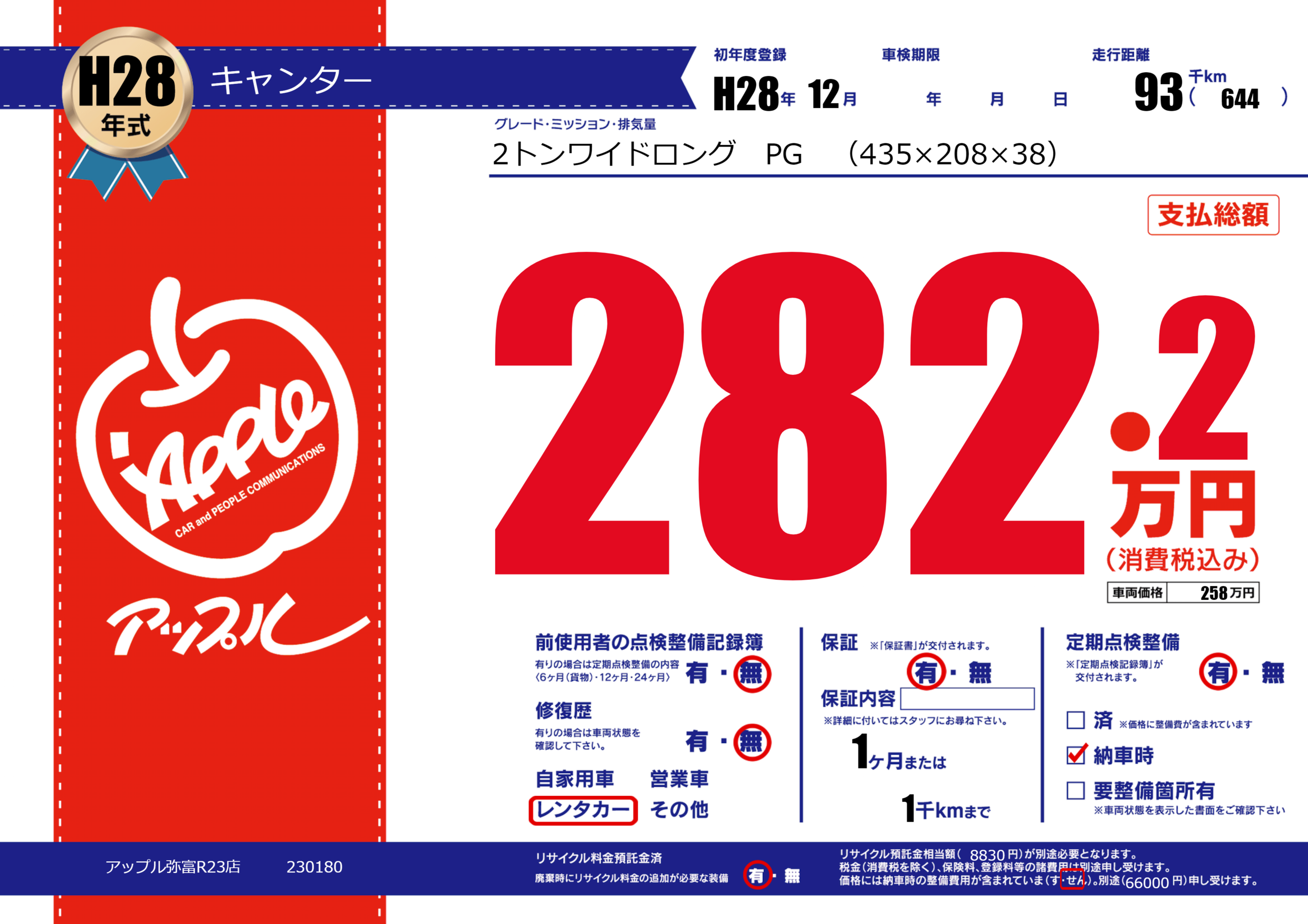 | 走行キロ | 9.3万km | 初年度登録 | H28年12月 |