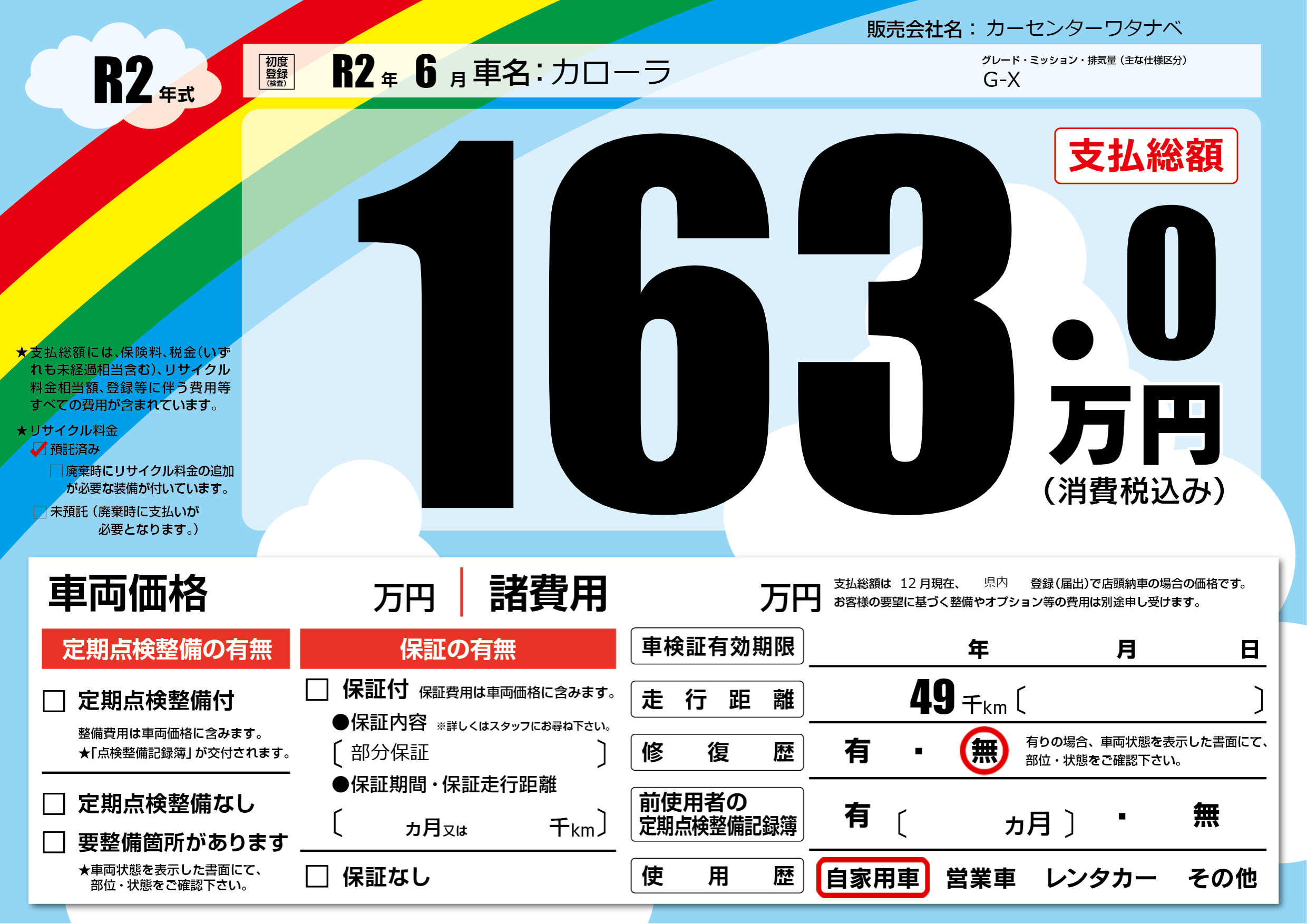 | 車名 | カローラ | グレード ミッション 排気量 |