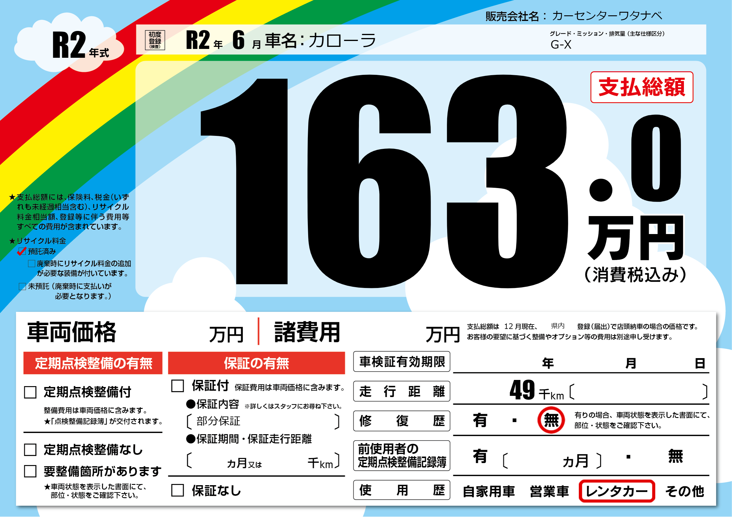 | 車名 | カローラ | グレード ミッション 排気量 |