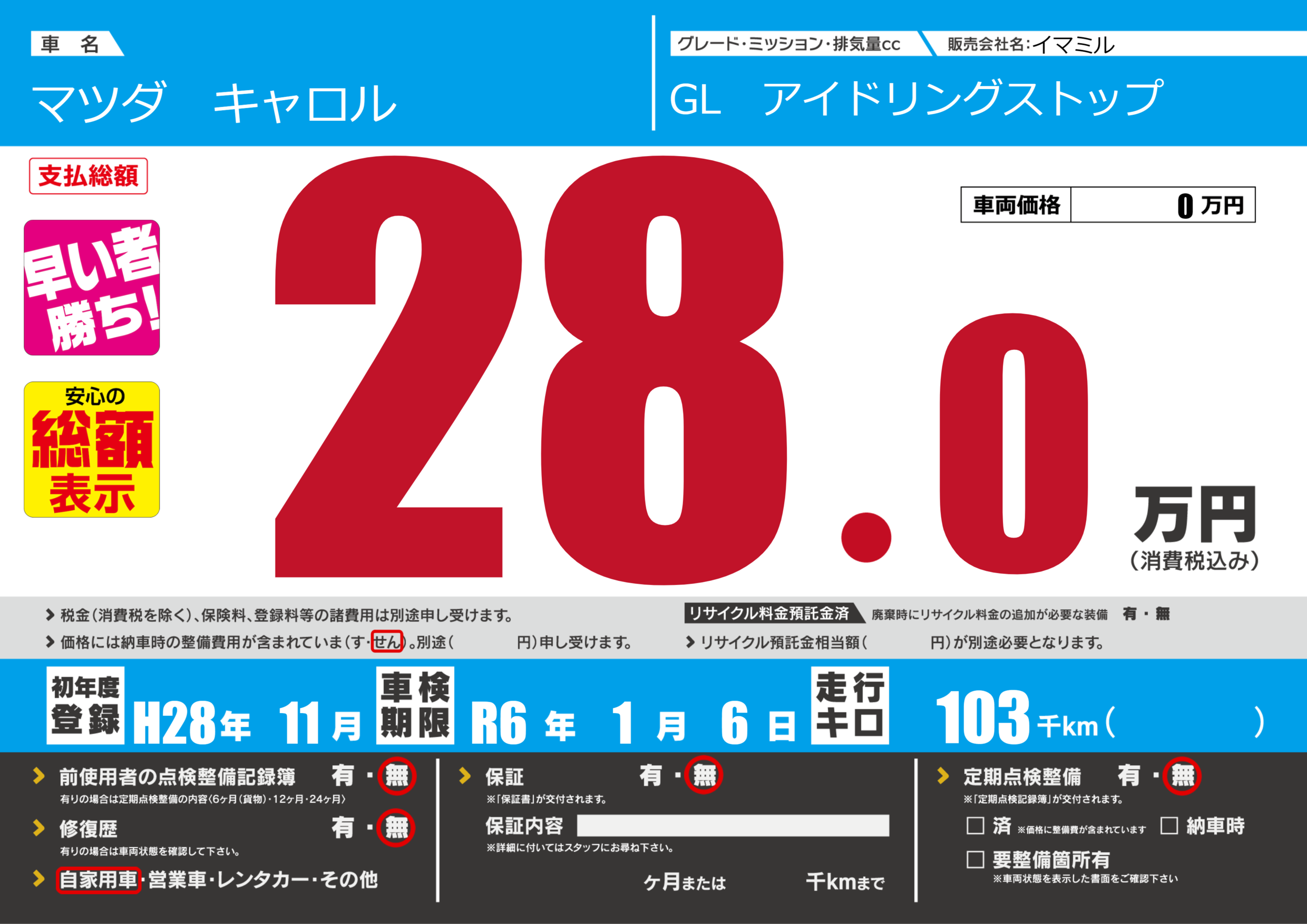| 走行キロ | 10.3万km | 初年度登録 | H28年11月 |
